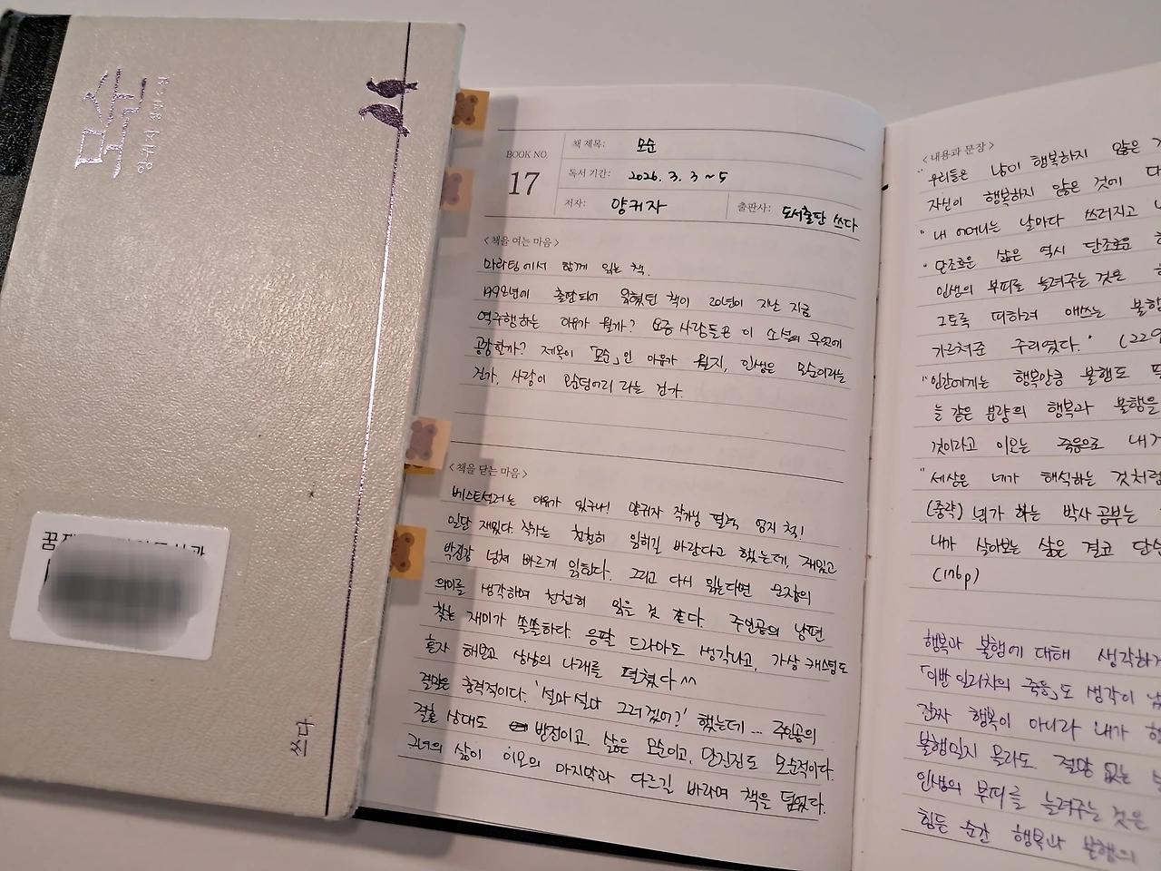 모두가 공감했던 이야기는 제목에 대한 것이었다. <모순>이라는 제목이 정말 잘 지어졌다는 것. 행복과 불행의 모순, 모순적인 인간의 모습이 제목 안에 그대로 담겨 있는 것 같다고. 그래서 이런 문장으로 모임을 마무리했다.