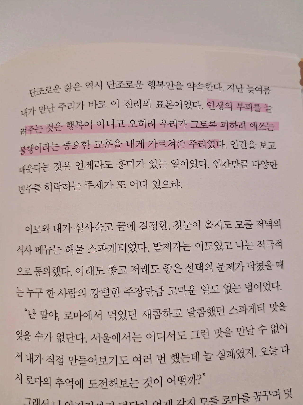 단조로운 삶은 역시 단조로운 행복만을 약속한다. (중략) 인생의 부피를 늘려주는 것은 행복이 아니고 오히려 우리가 그토록 피하려 애쓰는 불행이라는 중요한 교훈을 내게 가르쳐 준 주리였다.