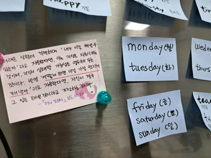 오늘의 필사 문장을 영어 단어 시험 보는 아들을 위해, 자주 열어 보는 냉장고에 딱 붙여 놓았다. 할 수 있다, 아들!