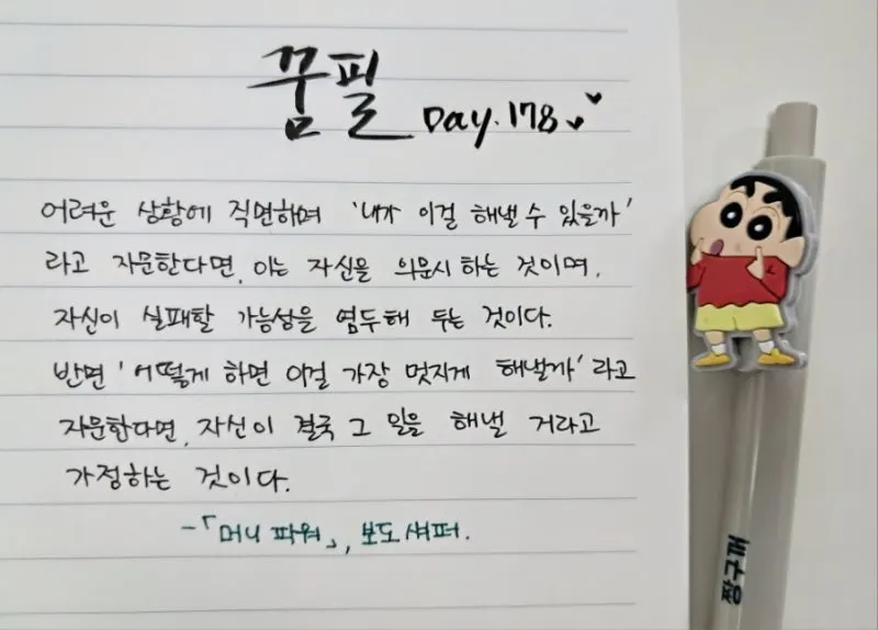어린 마음에 '할 수 있다'라는 흔한 말이 와닿지 않았고 대단해 보이지도 않았다. 하지만 본 대로, 들은 대로 나 또한 긍정적인 사고방식과 자신에 대한 믿음을 추구하며 살고 있다. 지레 겁먹고 내가 할 수 있을까 의심하기보다 '어떻게 브런치북을 멋지게 완성할 것인가'로 고민하는 쓰는 사람이 되기를. 나의 엄마처럼.