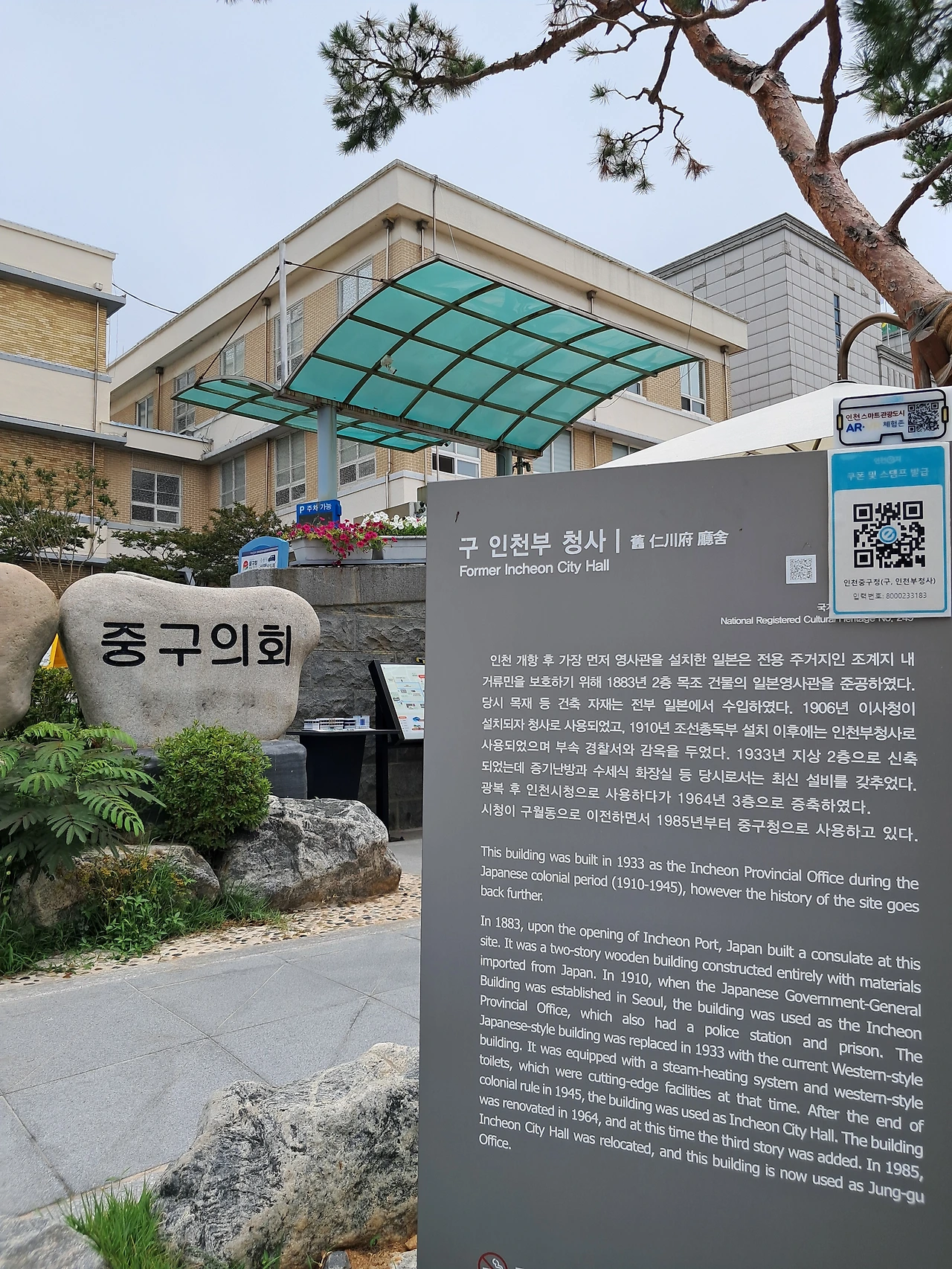 인천 개항 후 가장 먼저 영사관을 설치한 일본은 전용 주거지인 조계지 내 거류민을 보호하기 위해 1883년 일본영사관을 준공하였다. 1906년 이사청(理事廳-통감부의 지방 기관)이 설치되자 청사로 사용되었고, 1910년 조선총독부 설치 이후에는 인천부청사로 사용되었다. 1933년 지상 2층으로 신축되었는데 증기난방과 수세식 화장실 등 당시로서는 최신 설비를 갖추었다. 광복 후 인천시청으로 사용하다가 시청이 구월동으로 이전하면서 1985년부터 중구청으로 사용하고 있다.