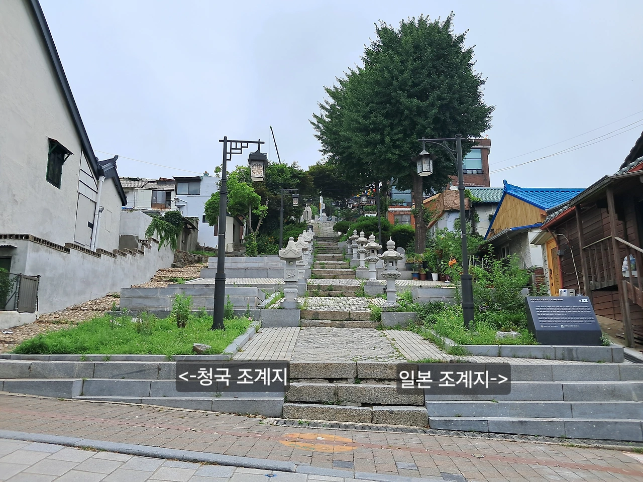 이 지역은 1883년 일본 조계(租界-개항 지역 인근에 외국인이 자유롭게 거주하며 치외법권을 누릴 수 있도록 설정한 구역)를 시작으로 1884년 청국 조계가 설정된 경계 지역으로, 만국공원(현 자유공원)으로 연결되어 계단과 조경이 마련된 공간이었다. 좌측으로는 청국, 우측으로는 일본의 조계지가 위치하였으며, 이 계단을 중심으로 청국과 일본의 건물들이 확연하게 서로 다른 양식들로 들어서 있었다. 각국의 자국민 보호를 위해서 설정한 조계지는 현재의 대사관과 유사한 영역이라고 할 수 있다. 우리의 영토를 타국에게 내어준 슬픈 역사를 담고 있는 현장을 보고 있자니 분하고 억울한 감정이 올라온다. '개항을 통한 근대 역사의 흔적임을 기억하자' 되새기며 돌계단을 성큼성큼 오르니 차이나타운과 개항장 거리, 인천항이 한눈에 들어온다.