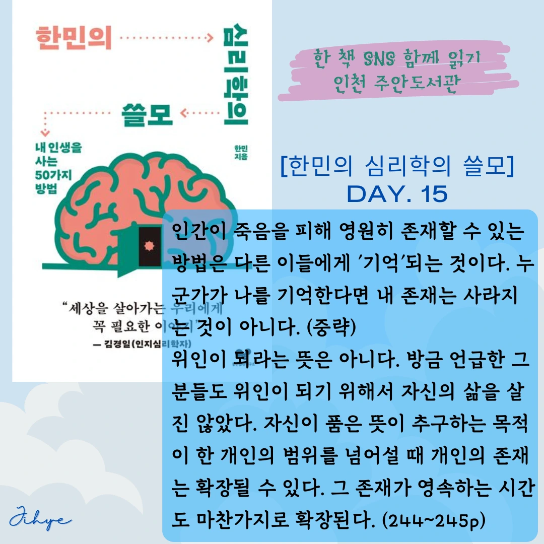 인간이 죽음을 피해 영원히 존재할 수 있는 방법은 다른 이들에게 '기억'되는 것이다. 누군가가 나를 기억한다면 내 존재는 사라지는 것이 아니다. (244p)