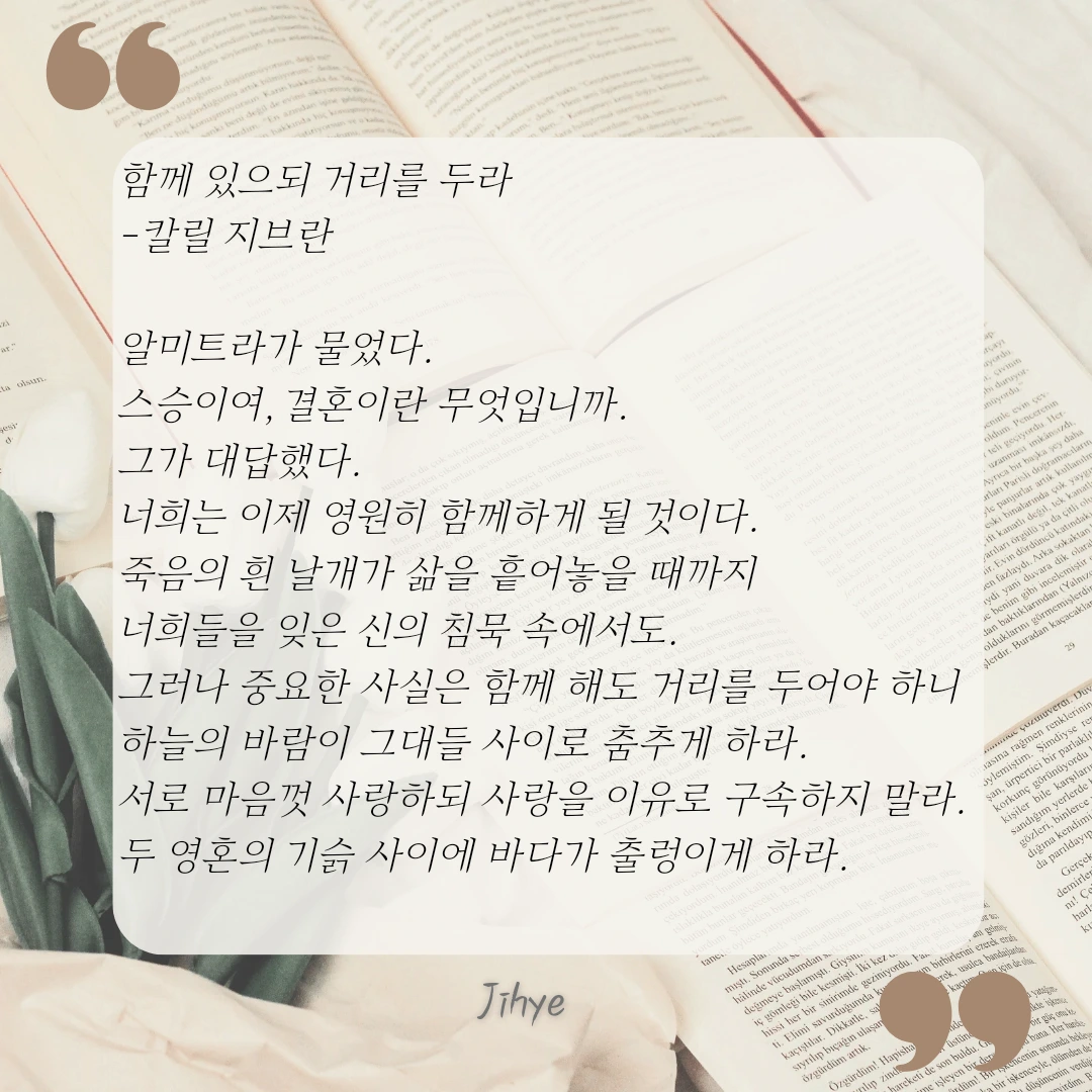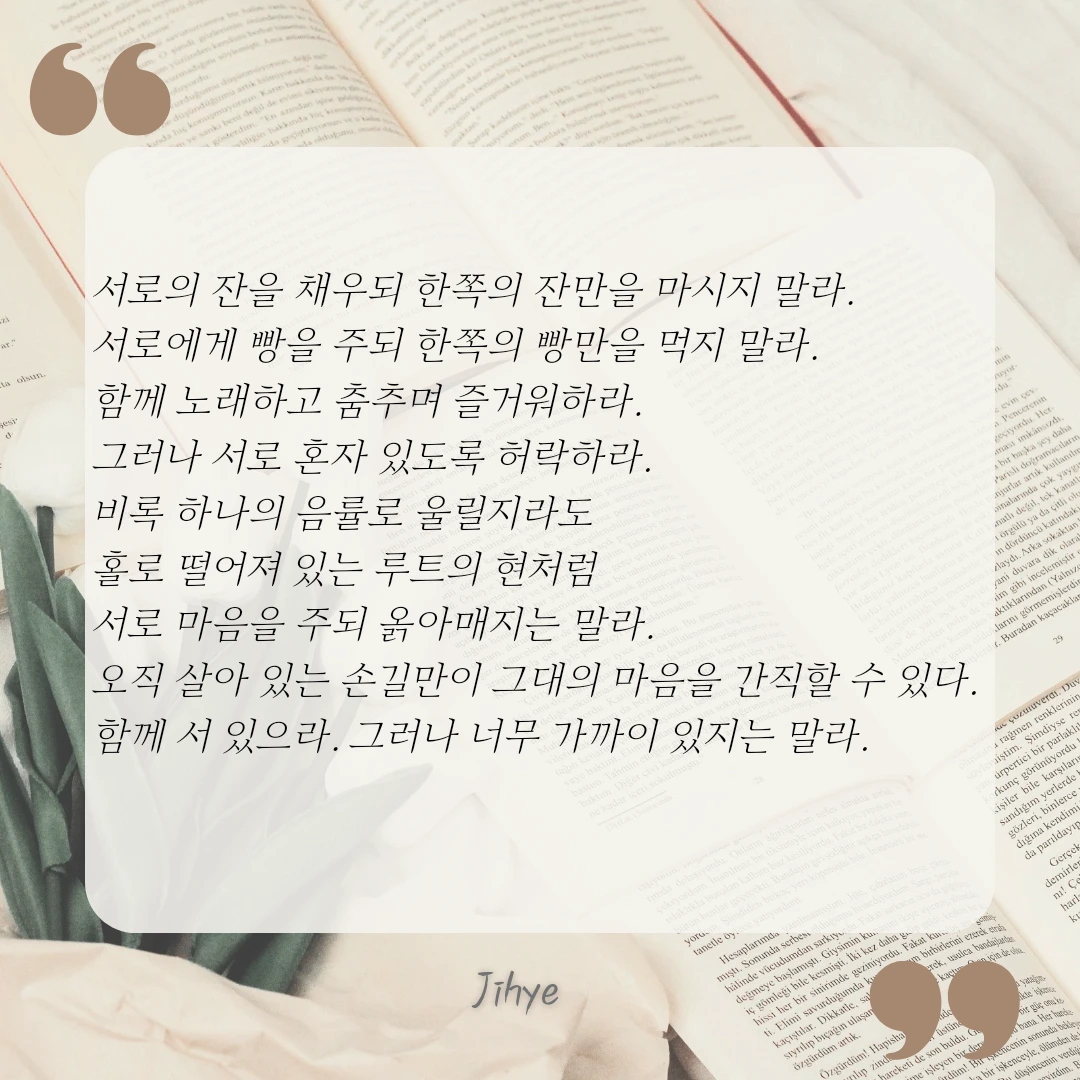 마음껏 사랑하되 사랑을 이유로 구속하지 않고, 서로 마음을 주되 옭아매지 말며, 함께 노래하고 춤추며 즐거워하나 서로 혼자 있도록 허락하는 것. 함께 있으되 바람이 지나갈 정도의 거리를 두면서.