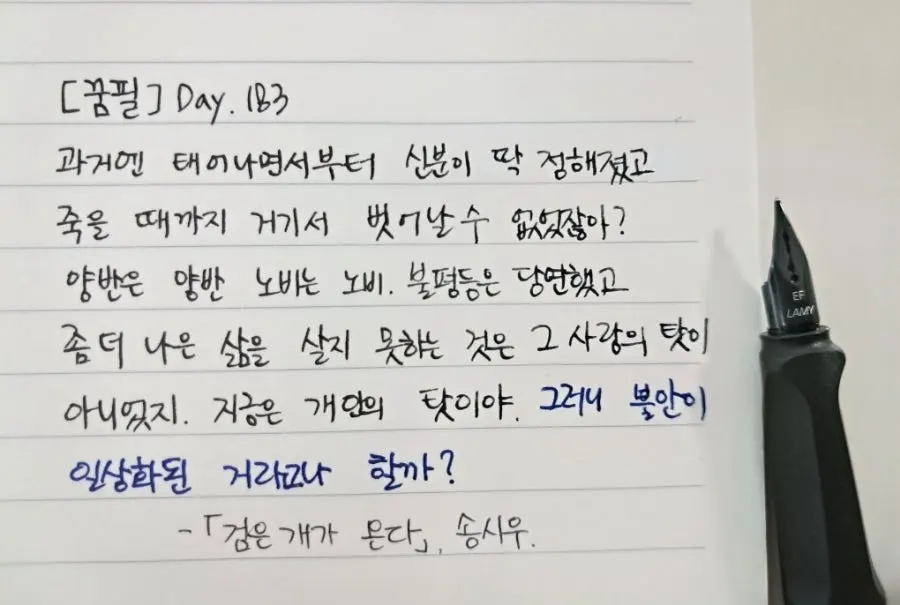 과거엔 태어나면서부터 신분이 딱 정해졌고 죽을 때까지 거기서 벗어날 수 없었잖아? 양반은 양반 노비는 노비 불평등은 당연했고 좀 더 나은 삶을 살지 못하는 것은 그 사랑의 탓이 아니었지. 지금은 개인의 탓이야 그러니 불안이 일상화된 거라고나 할까?