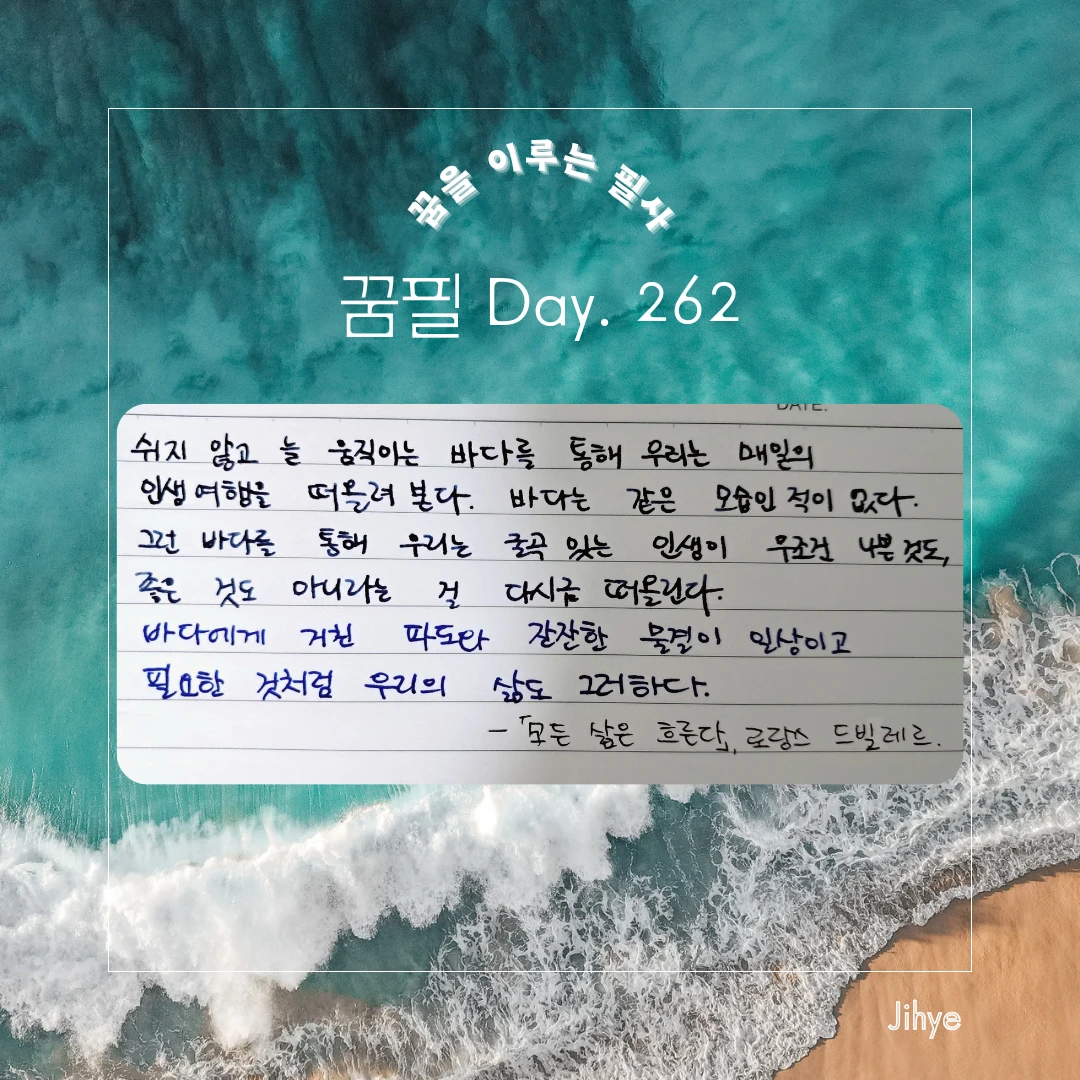 거친 파도에서 허우적대도, 수많은 섬처럼 다양한 문제를 만나도, 잔잔한 물결을 지나가는 순간도 모두 기록으로 남길 수 있는 쓰는 사람이 되기를.