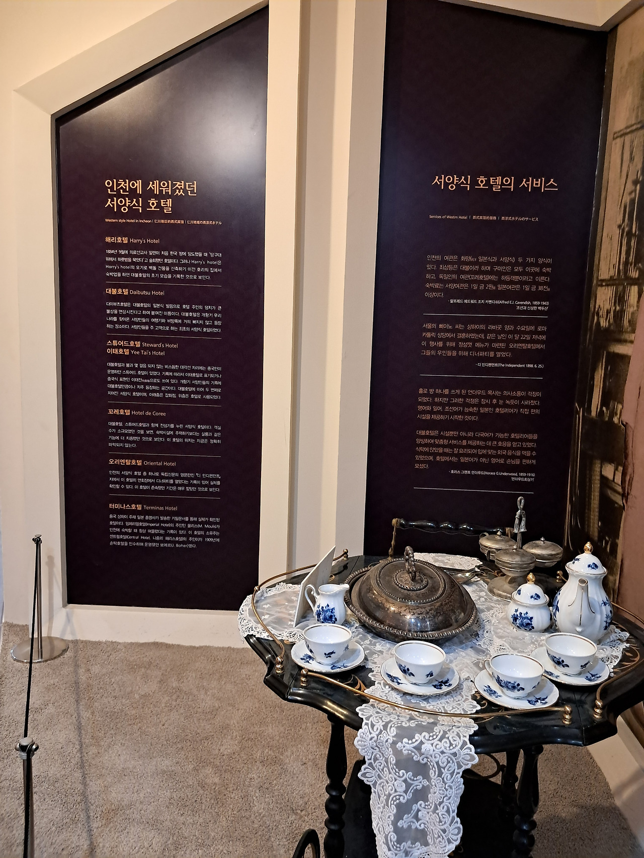제2전시실에서는 인천에 세워졌던 일본식 여관과 서양식 호텔의 운영방식, 제공된 서비스와 관련된 내용, 근대 호텔의 모습, 근대의 커피 이야기, 전화기와 전신기, 카메라, 회중시계 등의 신문물에 대해 전시하고 있다. 커피를 숭늉과 비교해 양탕국으로 불렸다는 것, 국내 최초로 커피를 제공했던 장소가 대불호텔이라는 사실, 멋스러운 그때의 다기와 커피메이커, 테이블웨어가 나의 눈길을 사로잡았다. 또한 제2전시실 건너편에 있는 재현된 대불호텔의 객실의 가구들은 지금 봐도 고풍스럽다.
