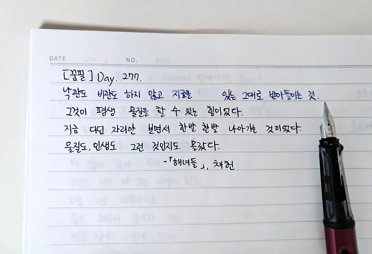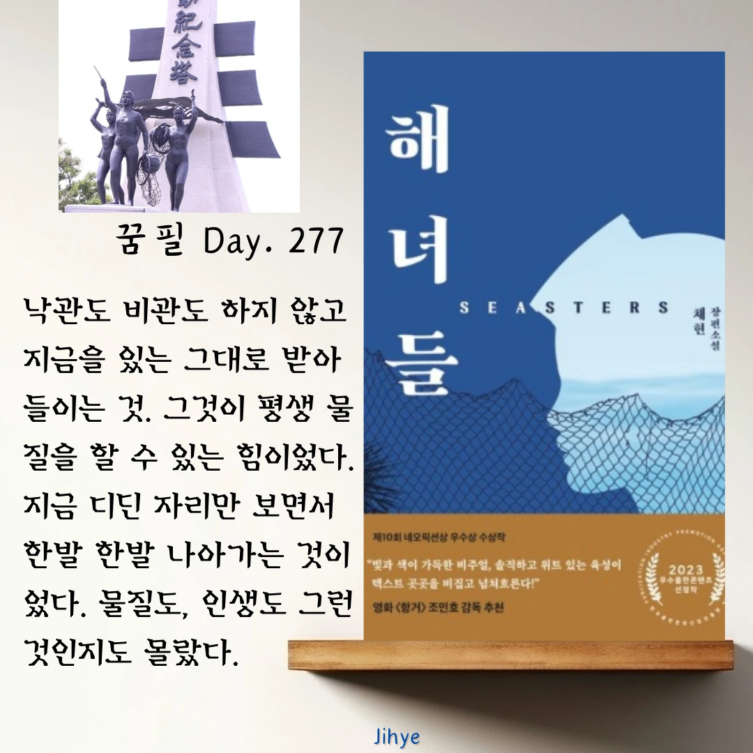 솟아날 구멍은 있고 해보지 않으면 모르는 일이 있다. 걱정만 해서는, 투덜대기만 해서는 절대로 이룰 수 없는 것을 향해 우리는 해녀들처럼 한발 한발 내디딜 수 있어야 한다. 낙관도 비관도 아니하고 그저 한발 한발 나아갔던 '해녀 정신'을 생각한다.