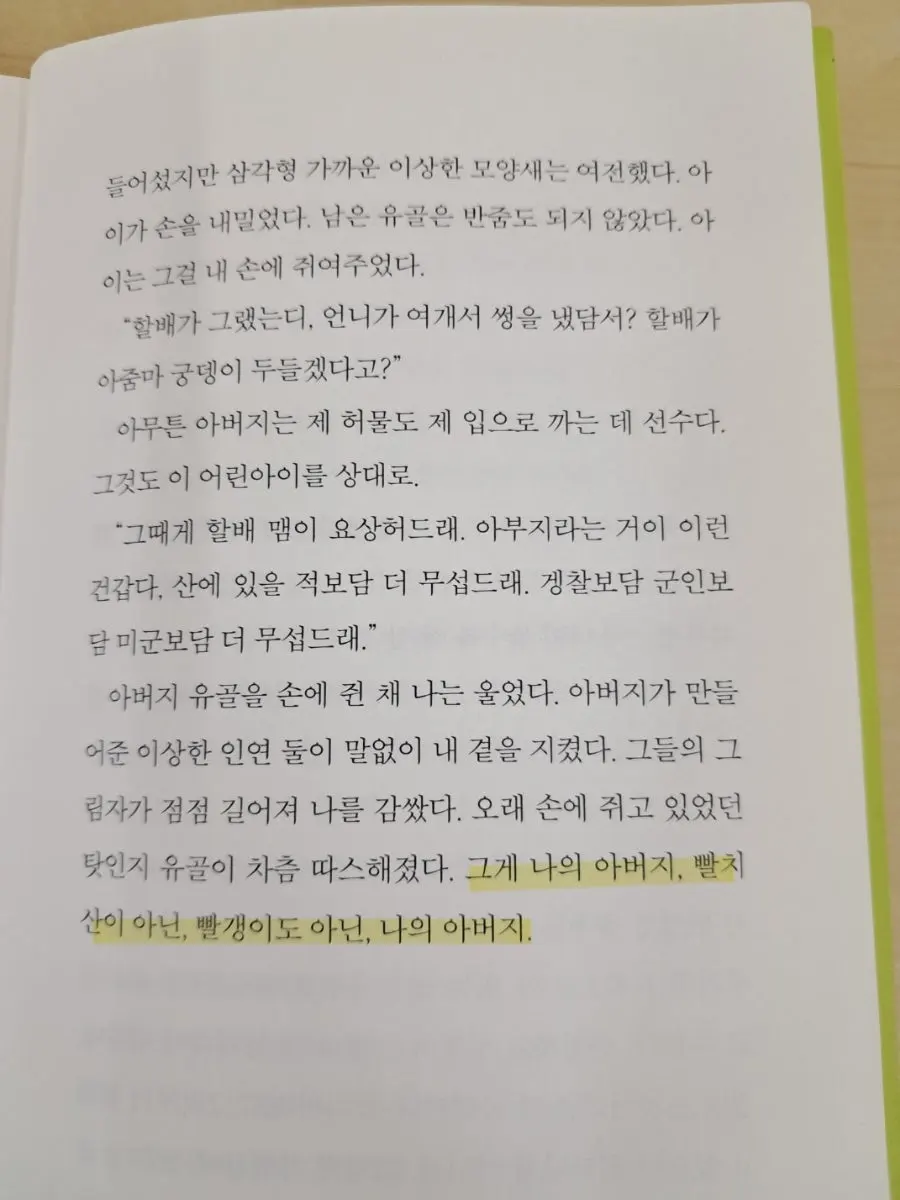 좌•우익이 모두 모인 빨치산 아버지의 장례식장이 '현대사의 축소판'이라는 작가의 표현이 와닿았다. 나도 모르게 '반공 이데올로기' 프레임으로 빨치산들을 바라보진 않았나. 주인공의 아버지는 인간적이고 매력적인 사회주의자요 혁명가란 생각이 들었다. 젊은 시절 가족보다 사상을 선택하긴 했으나 그의 삶은 대체적으로 사상보다 사람의 도리가 먼저였다. 20살의 순경도 살려주고, 비행청소년에게 담배 피우지 말라고 호통을 치며 친구가 되어준다. 그러나 인민의 사정을 다 이해해 주며 '마을의 머슴'을 자처해 가족을 힘들게 하기도 한다.