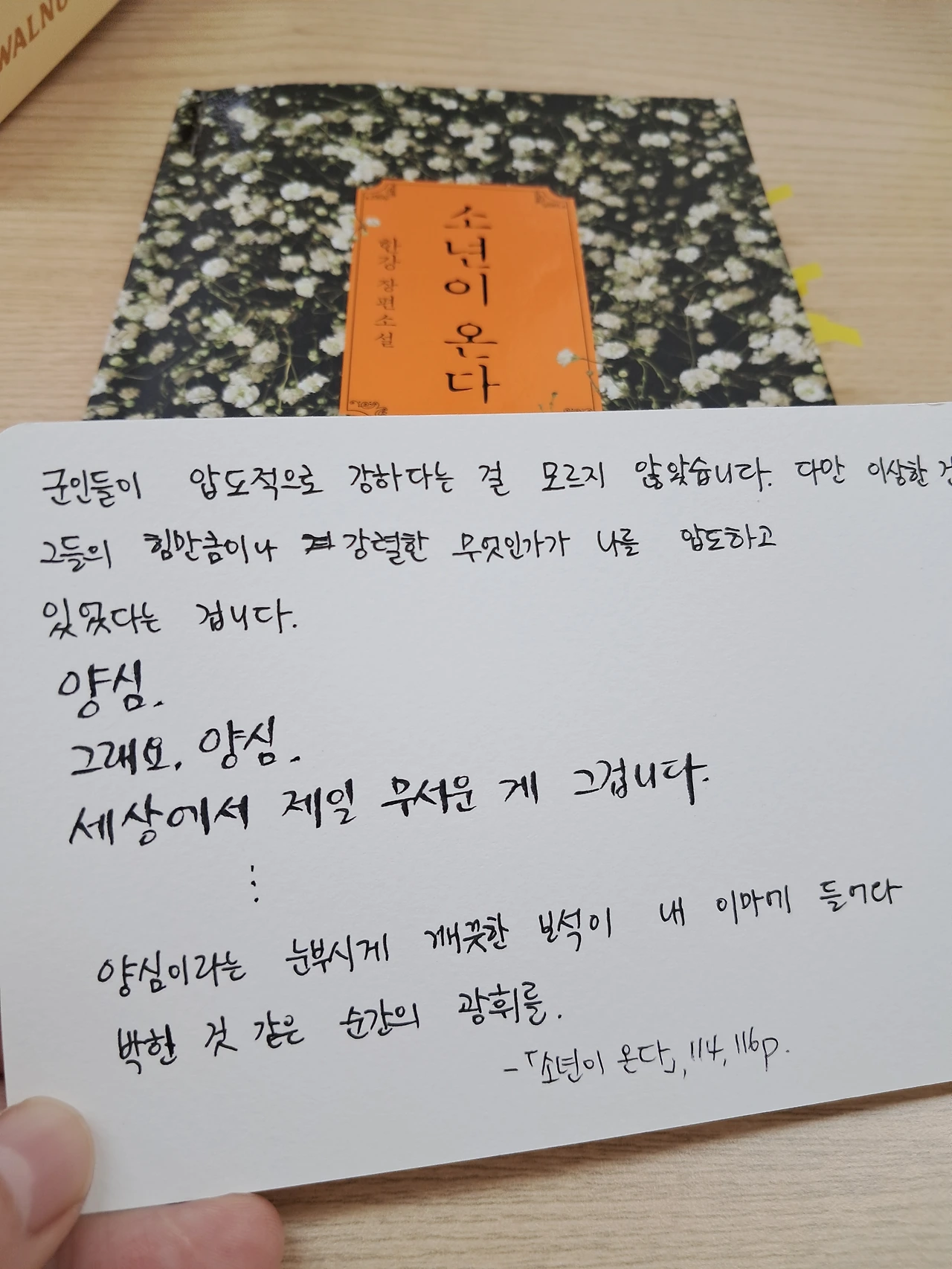 에필로그에서 '동호'의 작은형의 이 말이 나를 울렸다. 작은형의 부탁대로 작가는 제대로, 잘 쓰는 일을 해내 그날의 광주를 겪은 이들에게 따스한 빛을 선사한다. 작가가 받은 노벨문학상이 그들의 양심이 옳았다고 말해주는 역사적 평가가 아닐까?