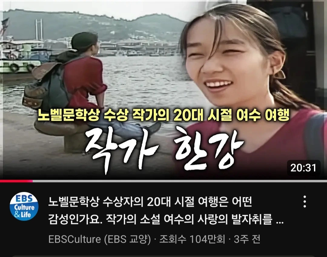 알고리즘이 알려줘서 'EBS 문학기행' 한강 편까지 봤다. '여수의 사랑'으로 여수를 여행하는 낭만과 지성과 가득한 프로그램. 20여 년 전의 앳된 작가님의 모습이 담긴 귀한 영상이다. '작가 한강'을 알아본 EBS의 안목에 박수를 보낸다.