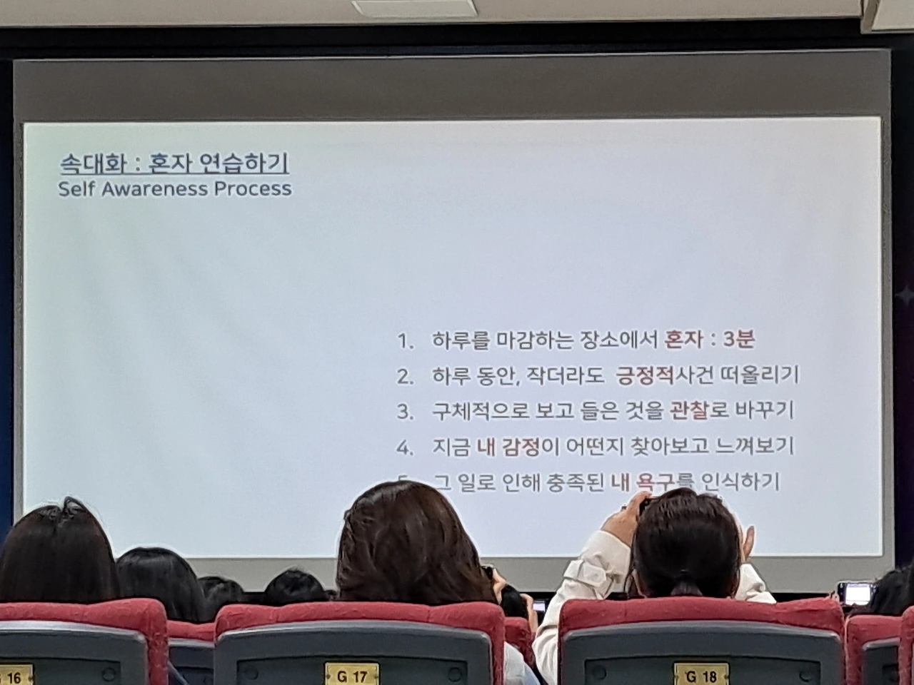 강연 시간 동안 청중을 가만히 두지 않으셨다. 구체적으로 손으로 표현해 보고 옆 사람과 연습해 보도록 시키셨다. 덕분에 뜬구름 잡기가 아닌, 좋은 얘기 듣고 왔다가 아닌 실생활에 적용할 수 있는 지침을 알 수 있어 유익했다. 강연장에서 만난 그녀는 자신의 전공인 상담 심리와 다양한 기관에서의 강연을 통해 터득한 지혜를 효과적으로, 선명하게 전달할 줄 아는 참 전문가였다.오랜 기간의 연구와 상담, 다양한 기관에서 진행한 워크숍과 강의를 통해 얻은 근거와 확신이 이를 가능하게 하지 않았을까, 그녀의 필모를 보다 깨달았다.