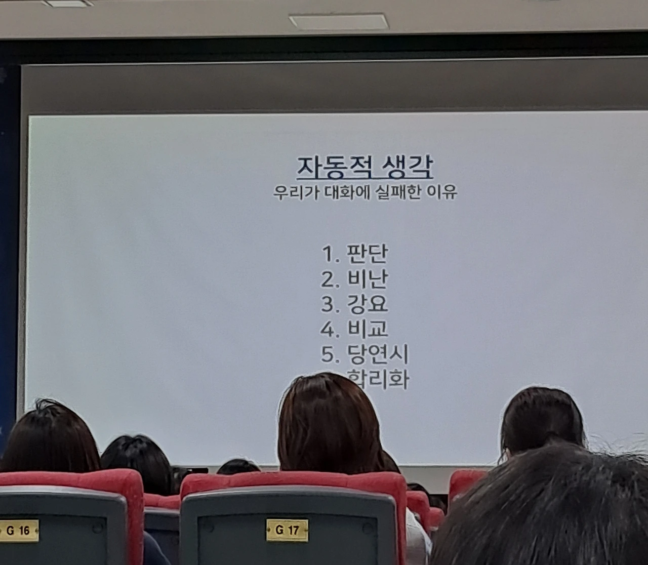 오늘의 주제는 사랑하는 내 아이를 위한 '연결의 대화'. 연구소의 홈페이지에 들어가 보니 '연결의 대화'는 아프고 슬픈 대화 방식의 대를 끊고 행복한 관계와 건강한 대화를 위해 소장님이 개발한 프로그램이라는 것을 알 수 있었다. 부모가 대화에 자주 실패하는 이유는 자녀의 말에 판단, 비난, 강요, 비교, 당연시, 합리와 하는 자동적인 반응 때문이라고 하셨다. 들려주신 예시들이 내가 아이들에게 뱉고 있는 말들이라 뜨끔했다. 이것만 안 하고 들어주기만 해도 대화가 더 진전될 텐데. 소장님 말대로 강의 내용을 핸드폰 배경화면에 깔아 놓고 매일 들여다봐야 하나보다. 다음으로 해야 할 것은 상대의 욕구를 헤아리는 공감적 듣기. 우선 내 욕구를 먼저 들여다보라는 말이 인상적이었다. 내가 무엇을 원하는지 알아야 상대에게 요구할 수 있고, 내 욕구가 해결되어야 자녀의 말도 들어줄 여유가 생길 테니까.