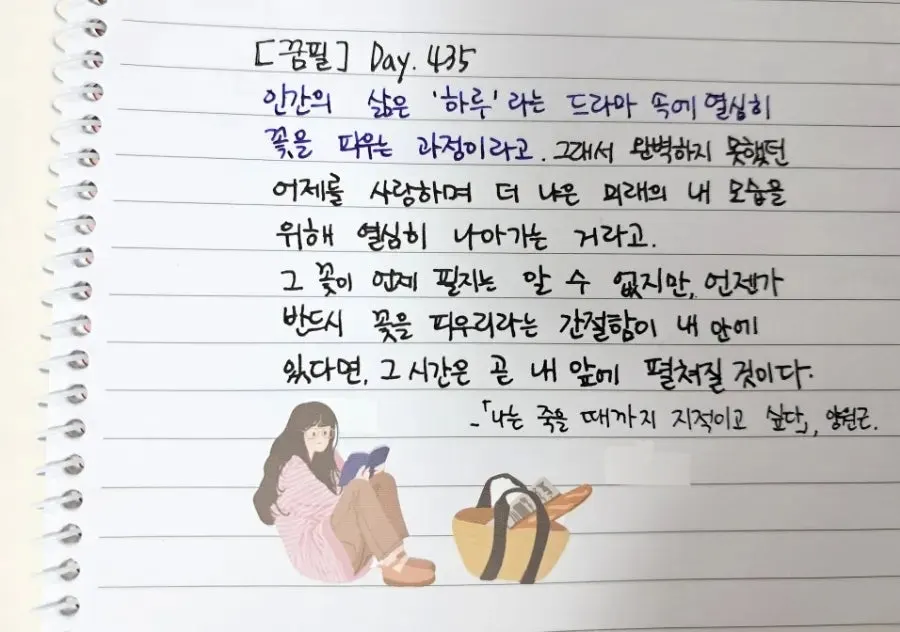 늦게 피는 꽃도 있으니 조급해하지 말고 계속 (자소서를) 쓰련다. 우리의 삶은 꽃을 피우는 과정이고, 늦더라도 언젠가 반드시 나만의 꽃을 활짝 피울 날이 올 테니까.