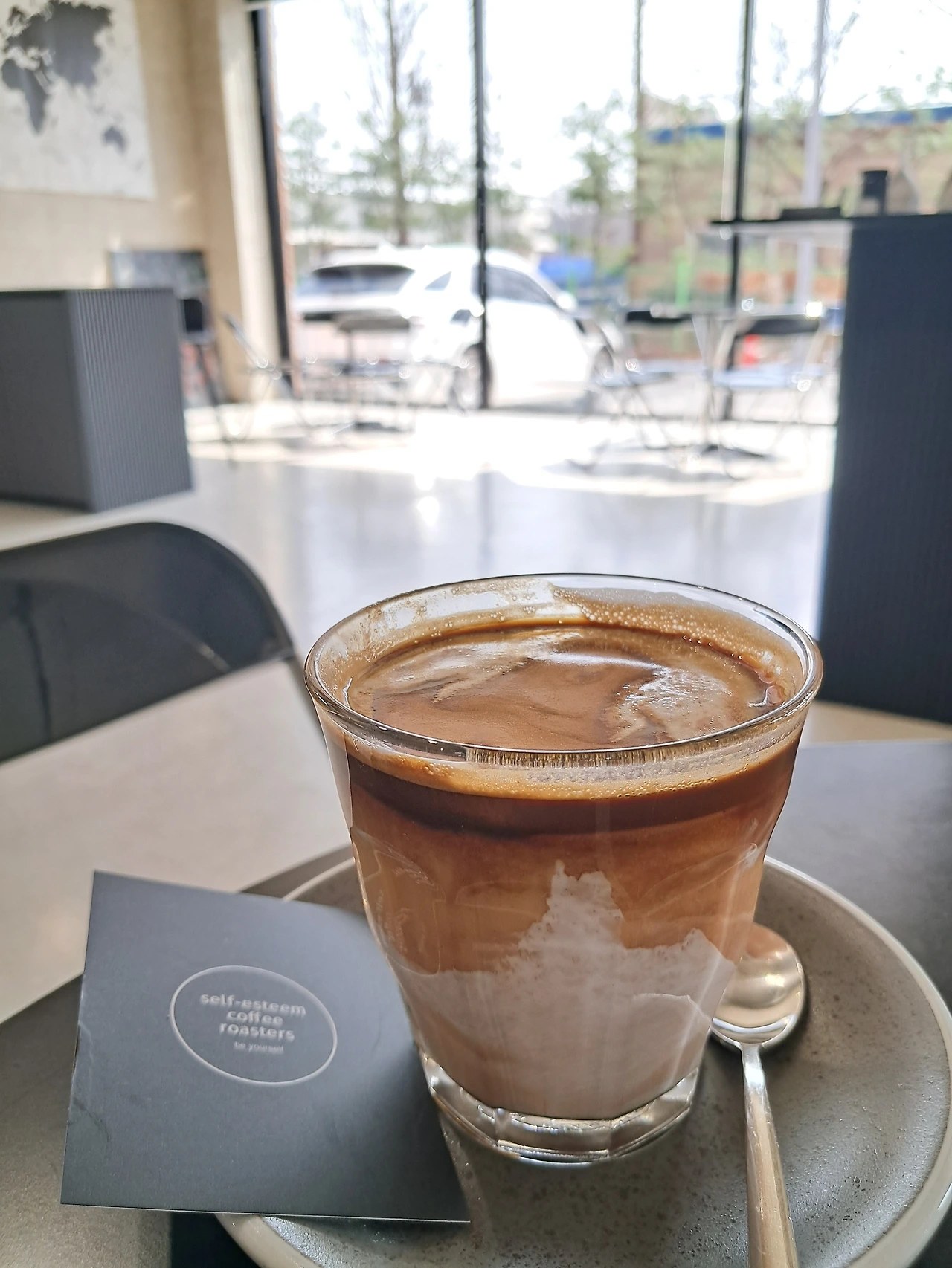 외부 음식 반입도 되는 커피 자부심 가득한 공간에서 나에게 크리미 라테를 사주고 스티커의 그녀처럼 셀카도 남기고. 무채색 인테리어의 카페에서 《무채색의 삶이라고 생각했지만》을 읽었다.