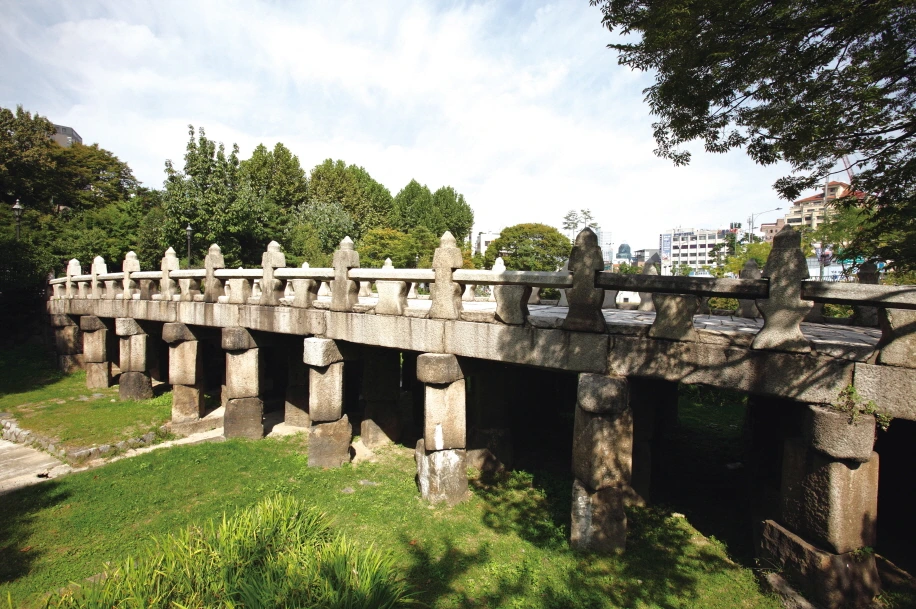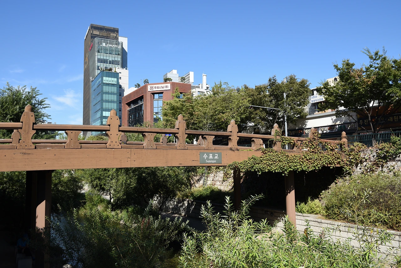 광통교와 함께 가장 유명한 다리로 1420년(세종 2)에 만들어졌다. 당시 이곳에 우마를 매매하는 마전(馬廛)이 있어서 마전교라 불렀으나, 1441년(세종 23)에 청계천의 물 높이를 측정하기 위해서 수표(水標)를 세운 이후 수표교라고 하였다. 1959년 청계천 복개공사 때 장충단공원으로 옮겨 보존하고 있다.