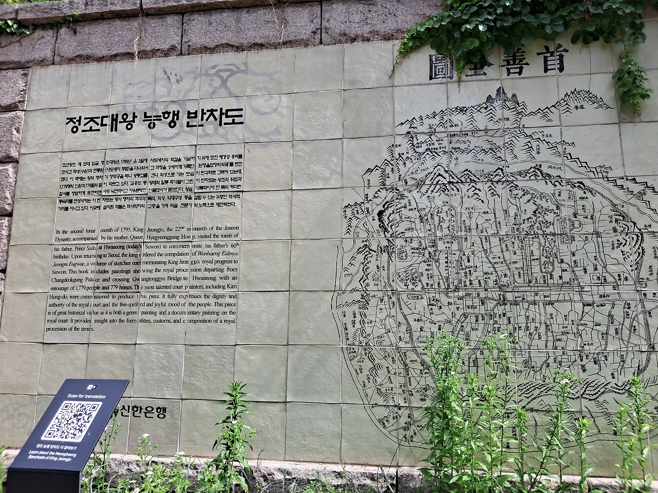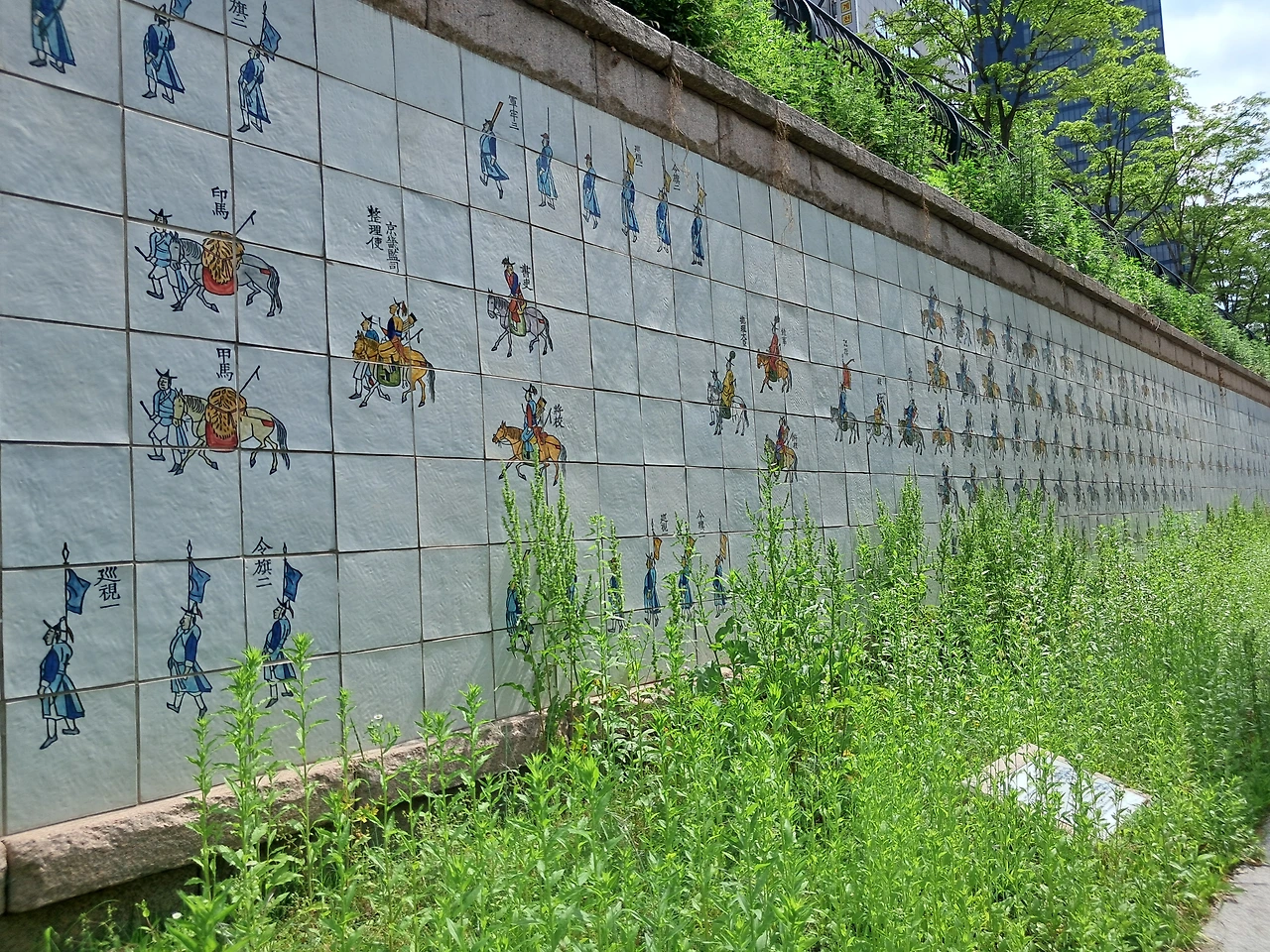 장통교 근처에 이르면 다리 아래에 타일로 표현한 옛 그림을 확인할 수 있다. 바로 '정조대왕 능행 반차도‘라 불리는 『을묘원행정리의궤』의 반차도이다. 1795년, 정조가 어머니 혜경궁 홍씨의 회갑을 맞아 어머니를 모시고 아버지 사도세자의 묘소가 있는 화성으로 행차하는 모습을 담고 있다. 이 그림에는 1,779명의 사람과 779 필의 말을 그려 놓았다. 그렇다면 타일은 모두 몇 개가 사용되었을까? 4,960장이라니, 놀랍다. 길이 186m, 폭 2.4m 규모로 기네스북에 오를 만한 가치가 있어 보인다.
