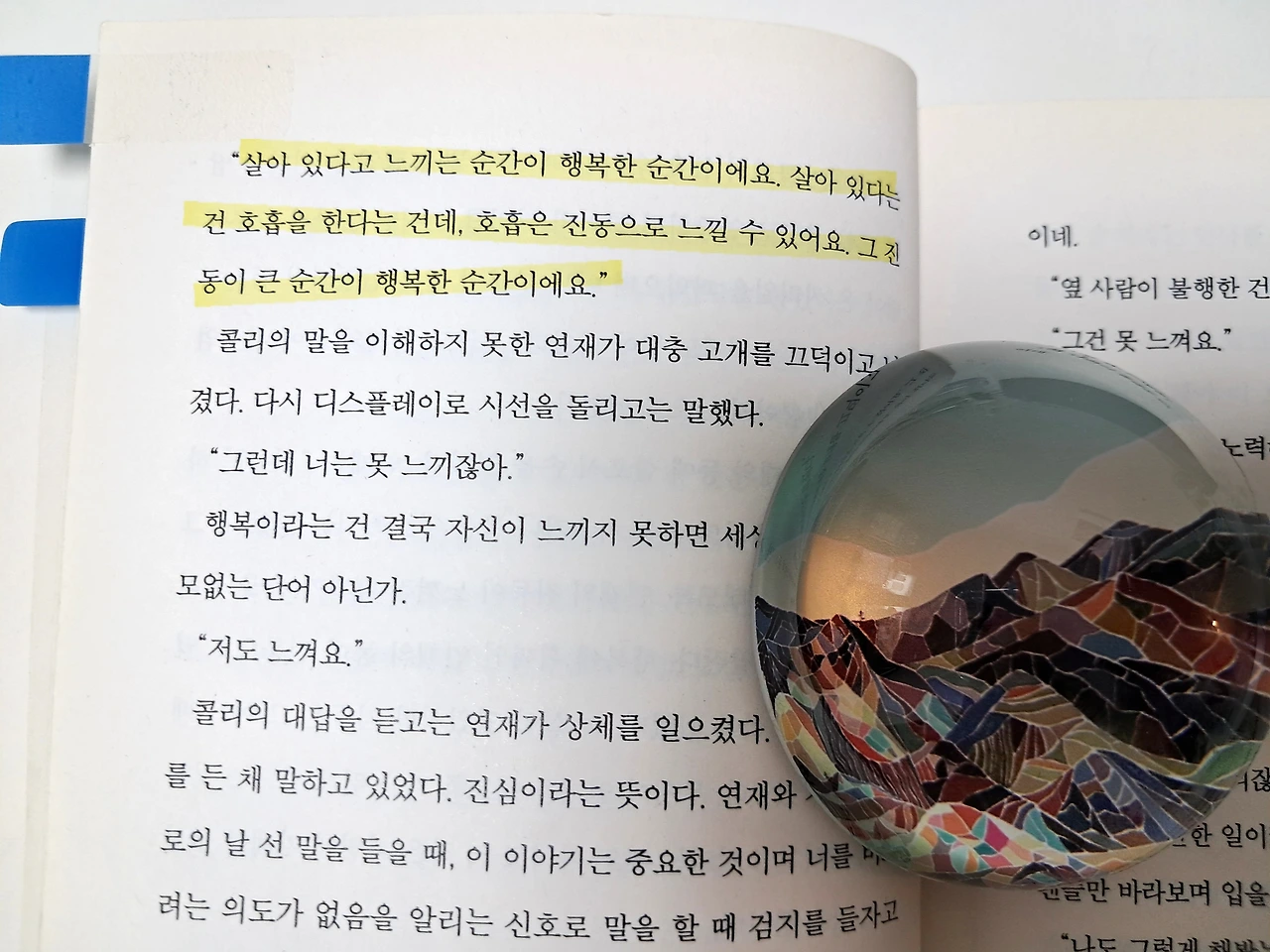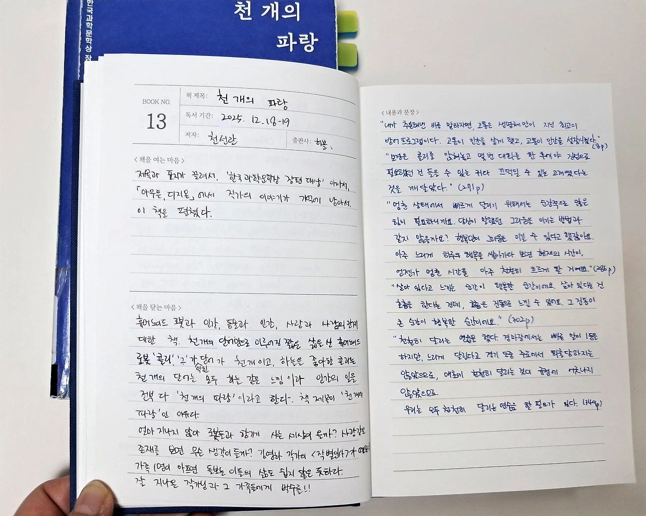 작가의 스승이 해준 이 말이, 갑자기 쓰러진 엄마가 지체장애인이 되고 엄마를 돌보는 일이 삶의 우선순위가 된 작가의 서사가 마음을 울려 이 문장에 한참 머물렀었다. 그리고 다른 사람의 마음을 울리는 작가의 단단한 이야기가 궁금했다. 그렇게 『천 개의 파랑』이 탄생했다는데, '한국과학문학상' 장편 대상 수상작이라고 하는데 어찌 안 읽을 수 있을까?
