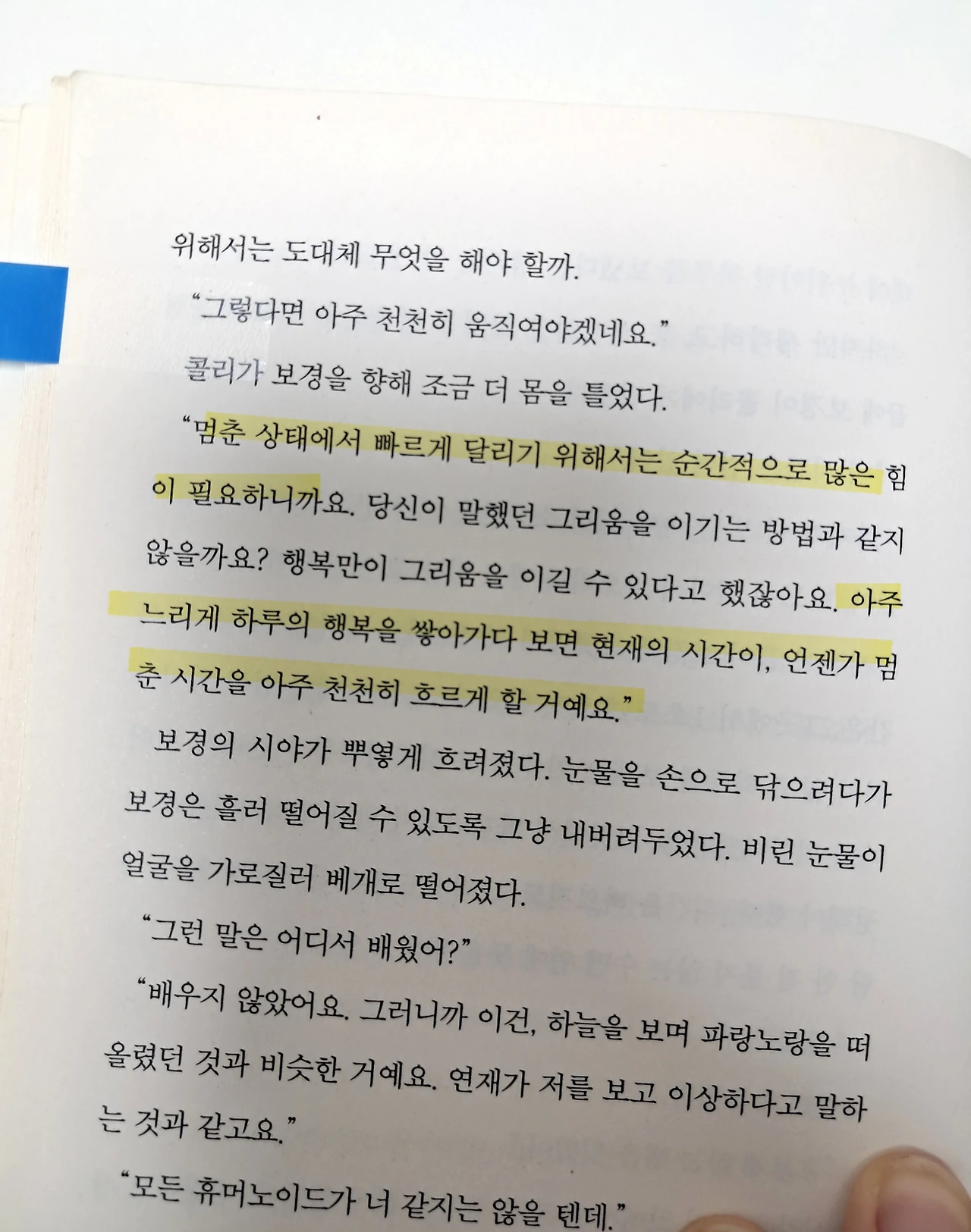 『천 개의 파랑』은 작가가 휴대폰 메모장에 적어놓은 한 줄에서부터 시작됐다고 한다. '우리는 모두 천천히 달리는 연습을 해야 한다'라는 문장이다. 그래서 그녀의 시선과 발걸음에 맞추어 천천히 페이지를 넘겼다.
