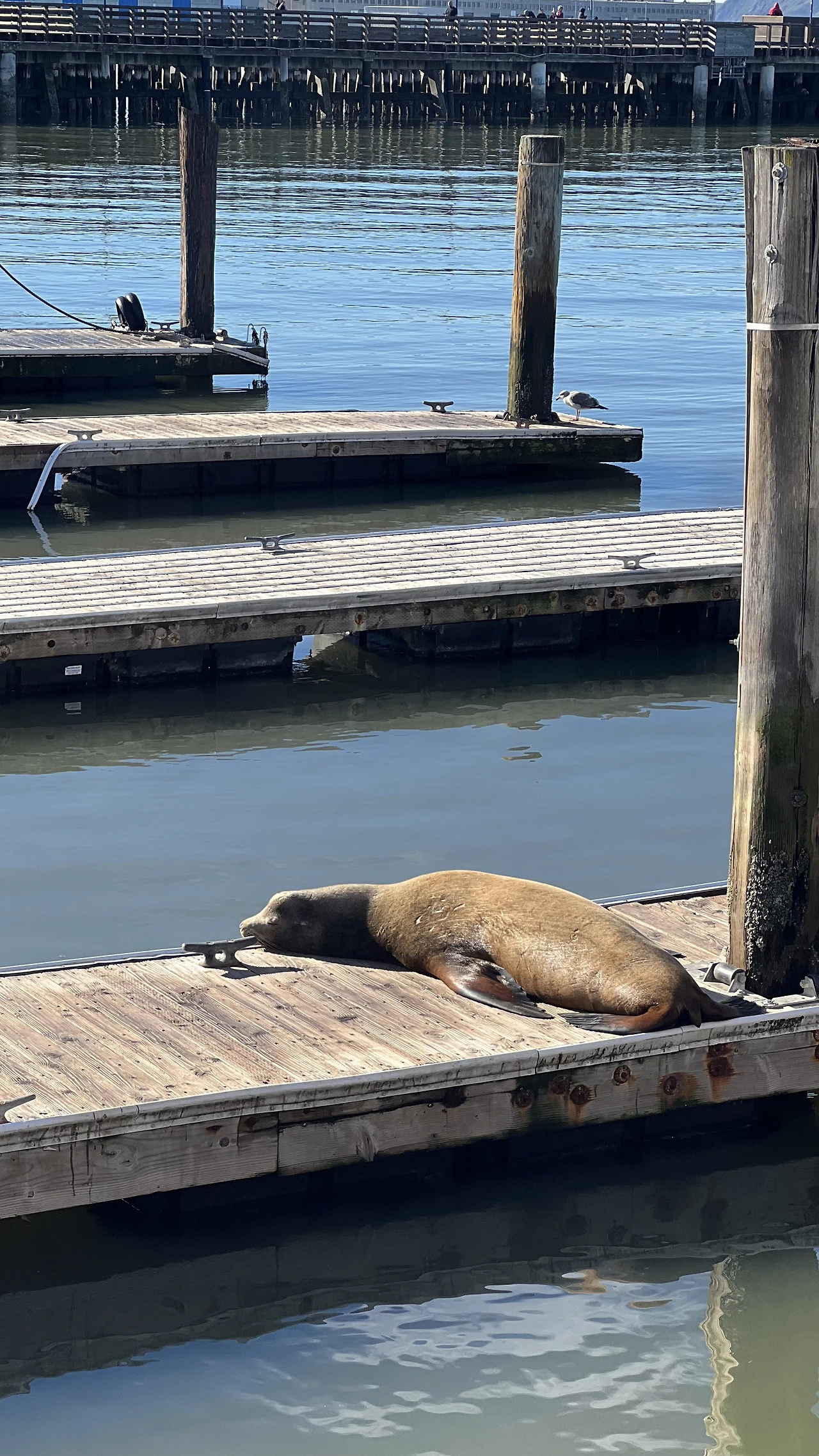 우리는 물속에서 유영하는 바다사자도 한참 바라봤다. 동물원이나 수족관이 아닌 곳에서, 자연 그대로의 바다사자를 이렇게 가까이 본 건 처음이었다. 시청각이 동시에 꽉 차올랐다. 울음소리, 물결 소리, 바다내음과 바다사자 특유의 비릿한 냄새까지. 그리고 더 놀라운 건, 그 풍경의 뒤에 금문교가 걸려 있었다는 사실이다. 바다사자와 금문교라니. 샌프란시스코를 한 컷에 담으면 이런 모습일까 싶었다.