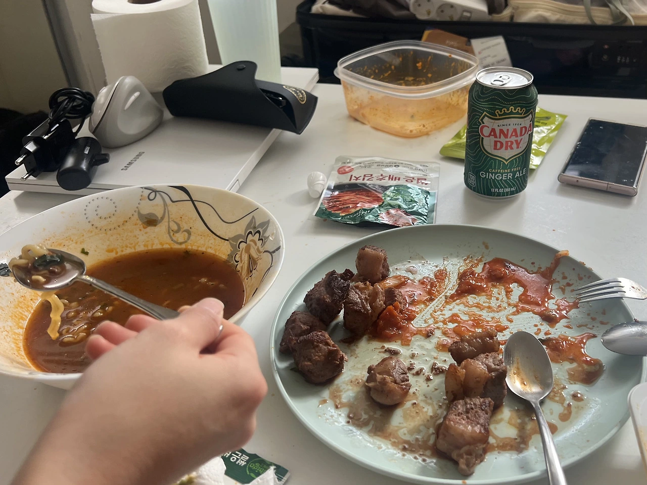 그와 동시에 라면을 한 냄비 끓이고, 햇반을 돌린 뒤 고추참치와 김가루를 넣어 비벼 간단한 비빔밥도 만들었다. 그렇게 차린 밥상을 언니와 동생에게 들고 들어가 셋이서 함께 먹었다. 룸메이트는 예전에 “가족을 공용 공간에서 마주치고 싶지 않다”라고 말한 적이 있어서, 나는 부엌에서 요리를 끝낸 후 방으로 가져오는 쪽을 선택했다.