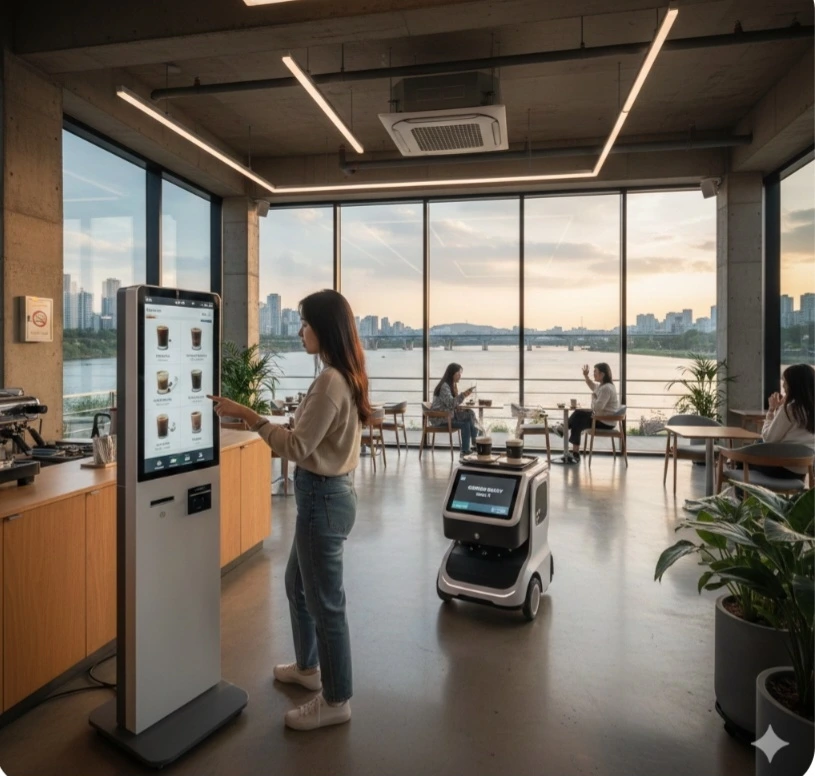 어느날 오이도에 위치한 음식점을 방문했다. TV에 방영된 까닭인지 문전성시를 이루고 있었다. 줄을 서서 기다린 끝에 드디어 음식점 안으로 들어가 자리를 잡았다. 바깥에서 기다리는 사람들로 인해 번잡스러웠던 것에 비해, 음식점 내부는 차분하고 조용했다. 우리 부부는 자연스럽게 음식을 키오스키를 통해 주문했다. 잠시후 낯선 친구가 우리 식탁 곁으로 다가왔다. 우리가 주문한 음식을 로봇이 운반해 온 것이다. 잠시 놀랐지만 우리는 당황하지 않고 식사를 마쳤다. 그때 식당 카운터 옆어 서있는 음식점 주인을 보았다. 가끔 손님이 식사를 마치고 떠난 자리를 청소하는 분이 간헐적으로 보일 뿐이었다.