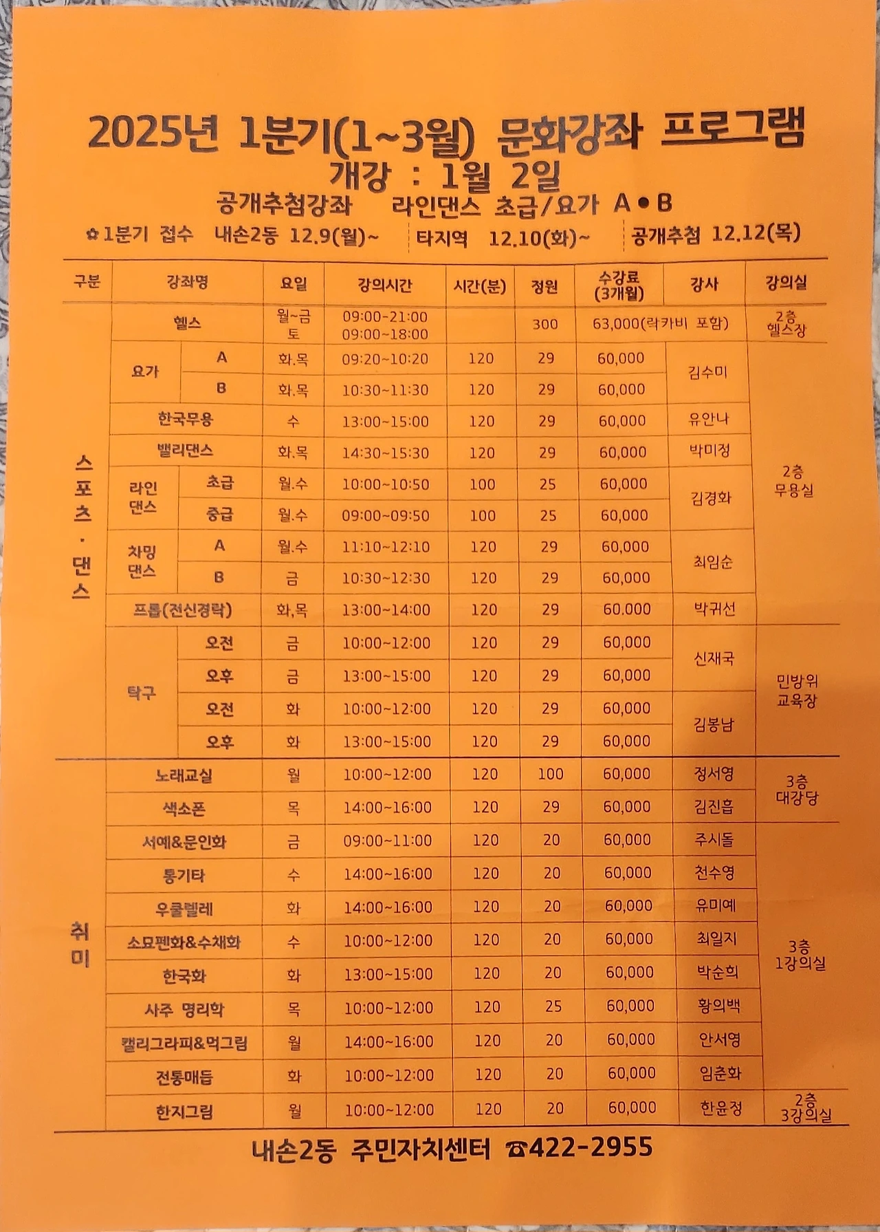 문화강좌 등록(내년 1분기 )