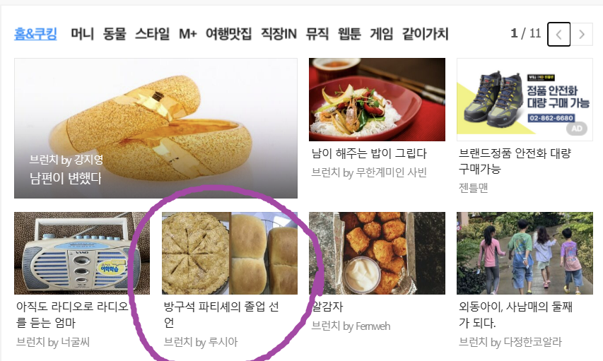 1월 9일 다음 메인에 오름. 강지영 작가님의 번쩍번쩍한 금반지에 가려 빵이 참 맛없어 보이긴 하지만 ^^ㅋ