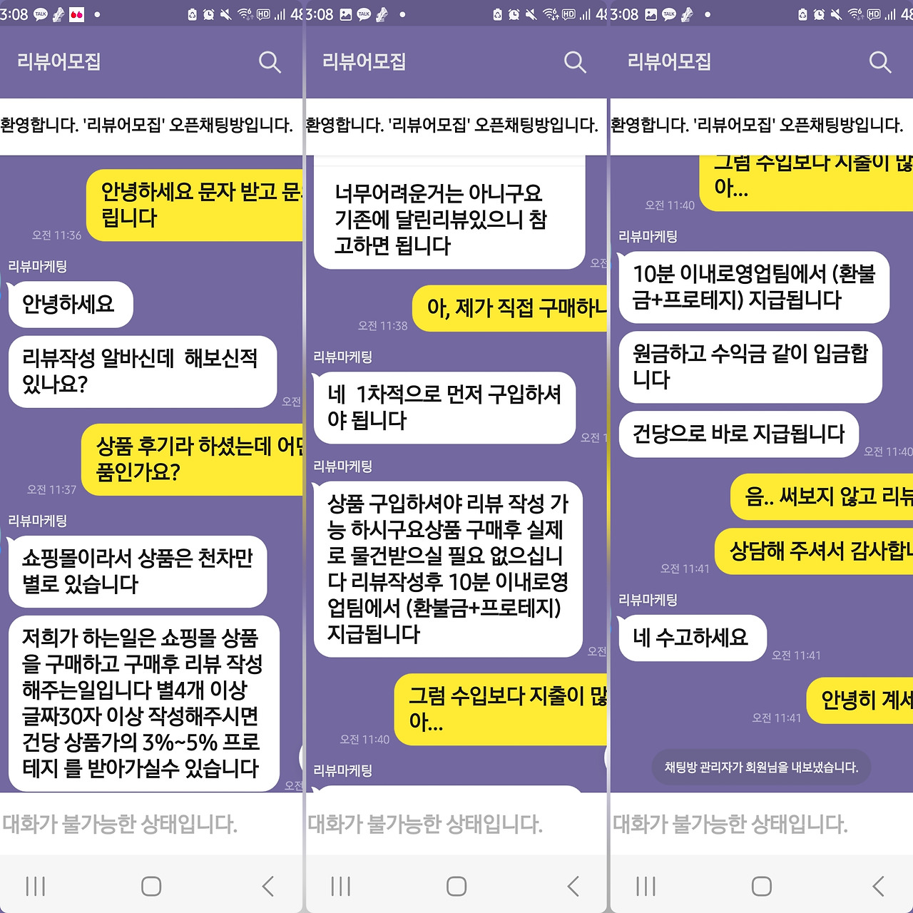 처음에 내게 선보일 물건은 저렴한 물건일 것이다. 처음 구매하는 것의 부담을 줄이고 접근을 쉽게 하려는 의도일 것이다. 구매했다고 하면 바로 10분 만에 원금과 5%에 해당하는 금액을 바로 환급해 줄 것이다. 그리고 두 번째 물건은 좀 전보다 비싼 물건, 그리고 세 번째는 더 비싼 물건. 리뷰를 쓰면 쓸수록 금액이 크면 더 많은 수익이 잡힌다는 건 당연히 깨닫게 될 것이고 오히려 내 쪽에서 수익을 더 내고 싶어 더 큰 금액의 물건을 리뷰하고 싶어 할 것이다. 왜? 바로 환불해 줄 거라는 믿음을 상대가 이미 주었기 때문에. 그래서 몇 백만 원에 해당하는 물건을 구매하면? 그럼 어떻게 될까? 당연히 그때부턴 함흥차사. 입금을 안 해줄 것이다. 생각이 여기에 미치자 이런 문자를 나만 받은 건 아닐 텐데 싶어 검색을 해 보았다.