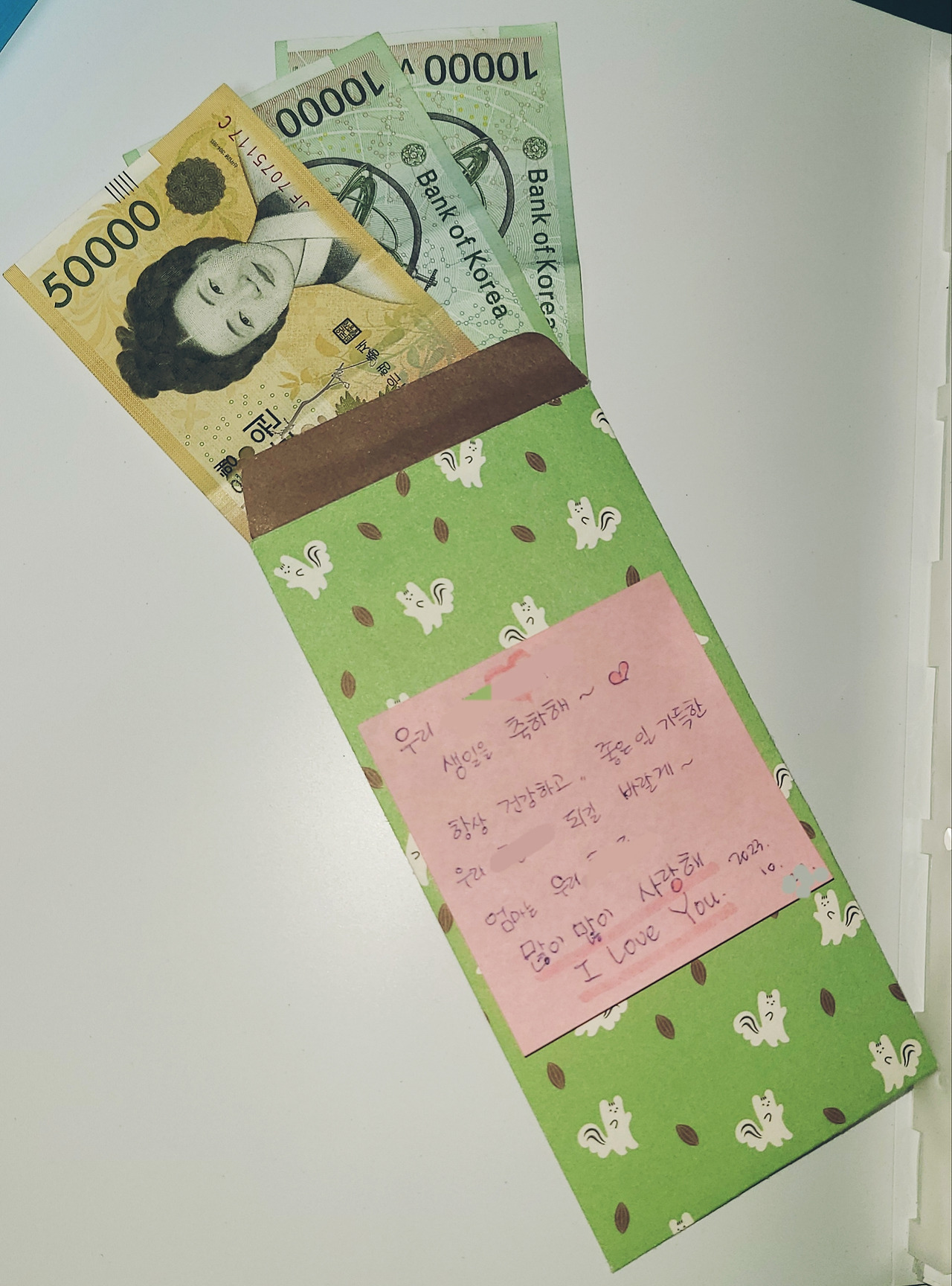 아침에 일어나 귀여운 편지봉투 하나를 골라 5만 원을 넣었다.