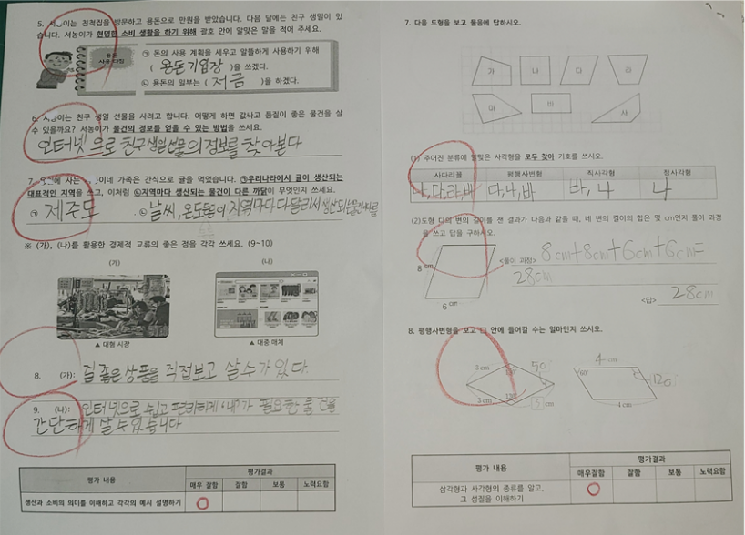조심스럽게 수학과 사회 수행평가지를 꺼내 보았다. 앞장에 각각 한 문제씩 비가 내렸다. 노력요함 치고는 동그라미가 많네. 뒷장부터 난리가 났나 보군. 하고 뒷장을 넘기는데 응? 다 맞았다. 얼른 훑고 아래 평가란을 보았는데 뭐지? 매우 잘함에 체크가 되어 있다.