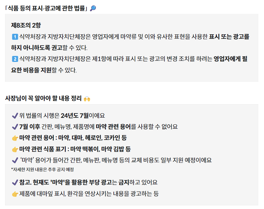 이런 연유로 기존에 마약김밥, 마약떡볶이, 마약통닭으로 자주 썼던 메뉴명에 마약이란 단어를 너무 쉽게 가져다 쓰는 게 아닐까 하는 글을 쓰려고 마음을 먹었는데 다행히 나와 같은 생각을 하는 사람들이 먼저 목소리를 내었고 법제화까지 진행하고 있다는 사실을 알게 되었다. 그리고 2024년 7월부터 마약김밥과 같이 메뉴명에 마약이라는 단어는 쓸 수 없다는 법조항이 시행된다는 것도 알게 되었다.