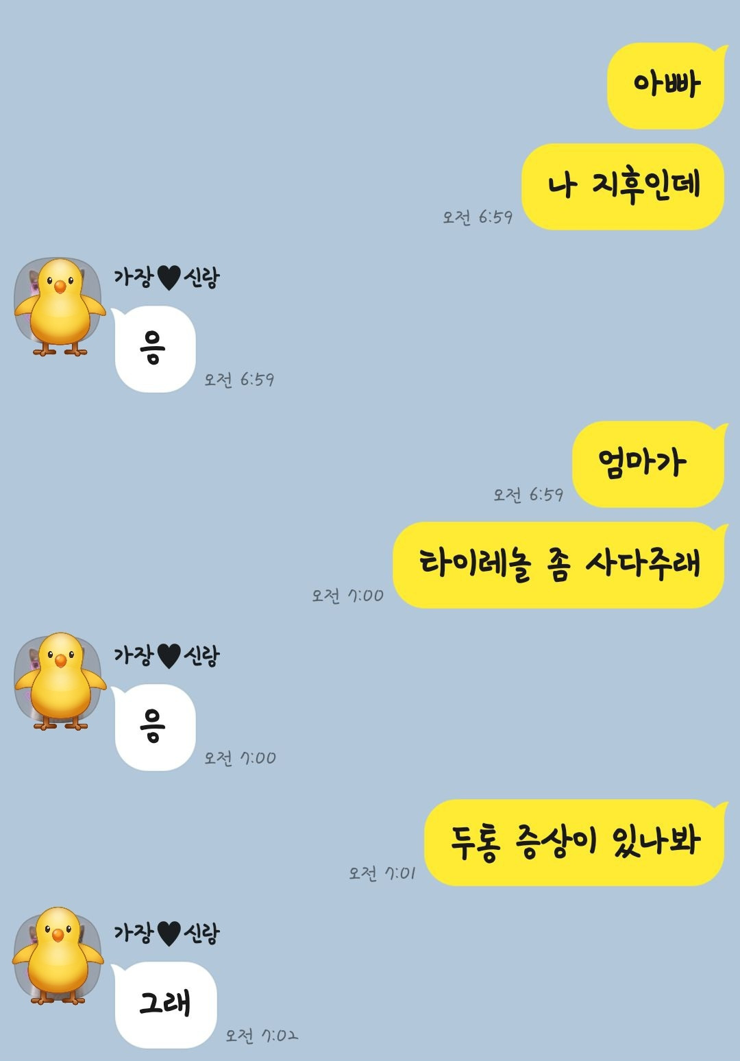 엄마가 아파도 자신은 아픈 엄마를 위해 딱히 뭘 해 줄 수 없어 안타까웠던지 막둥이는 엄마가 부탁을 해오자 드디어 자신이 할 수 있는 일이 있어 다행이라는 듯 냉큼 일어나 내 핸드폰을 열고 아빠에게 톡을 보낸다.