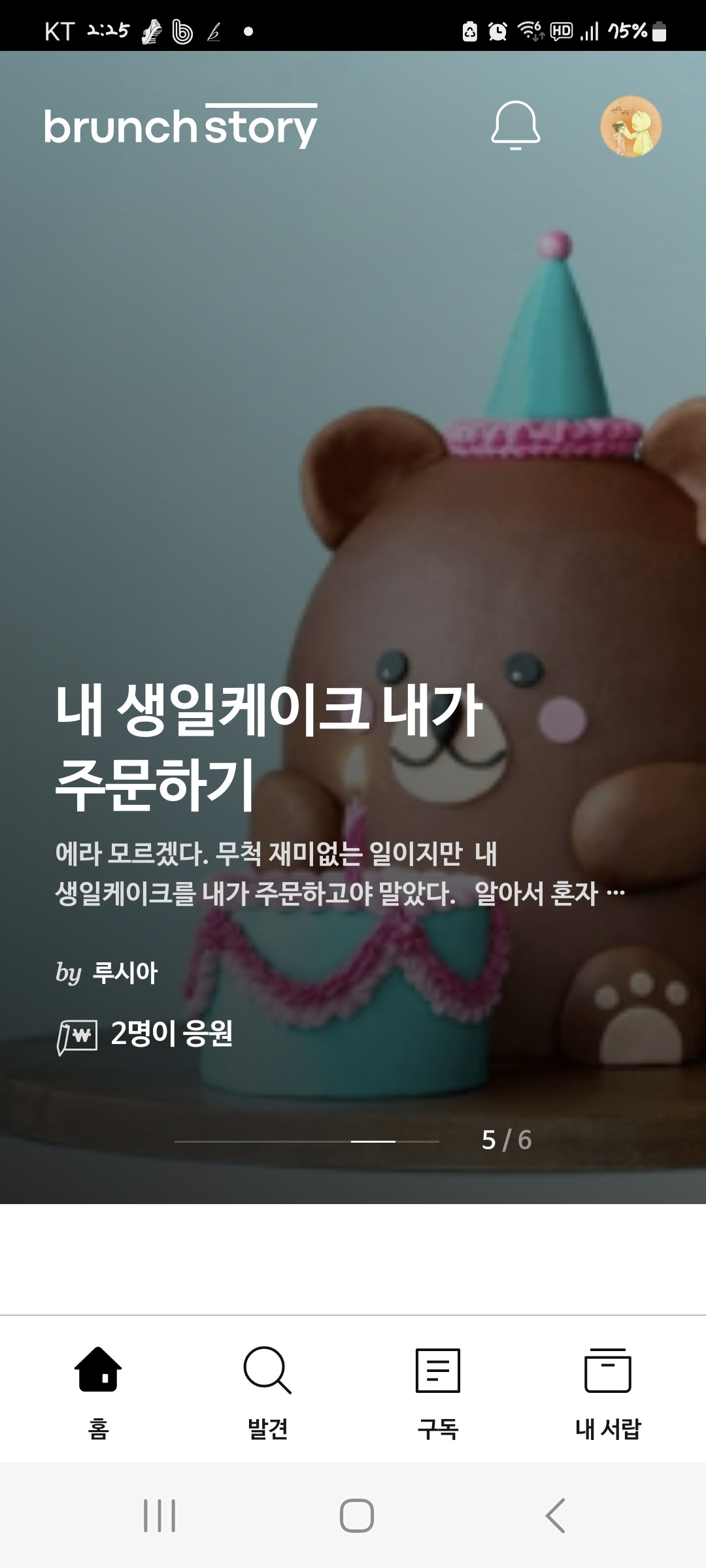 휴대폰으로 브런치 앱을 열어 제일 첫 화면, 제일 상단에 대문짝만 하게 글을 보여주는 그 자리에 오른 것이다. 내 생일을 자축했다는 글, 아무래도 이 글은 잘 써서 메인에 올랐다기보다는 응원하기를 받아서 메인에 올려준 것 같은 느낌적인 느낌이다. 응원받은 사람을 홍보해 줌으로써 이거 봐라, 브런치 응원하기에 대해 말이 많지만 보다시피 응원을 받는 사람이 이렇게 있지 않느냐? 하며 응원하기의 활성화를 꾀하려는 것 같은 느낌이랄까?