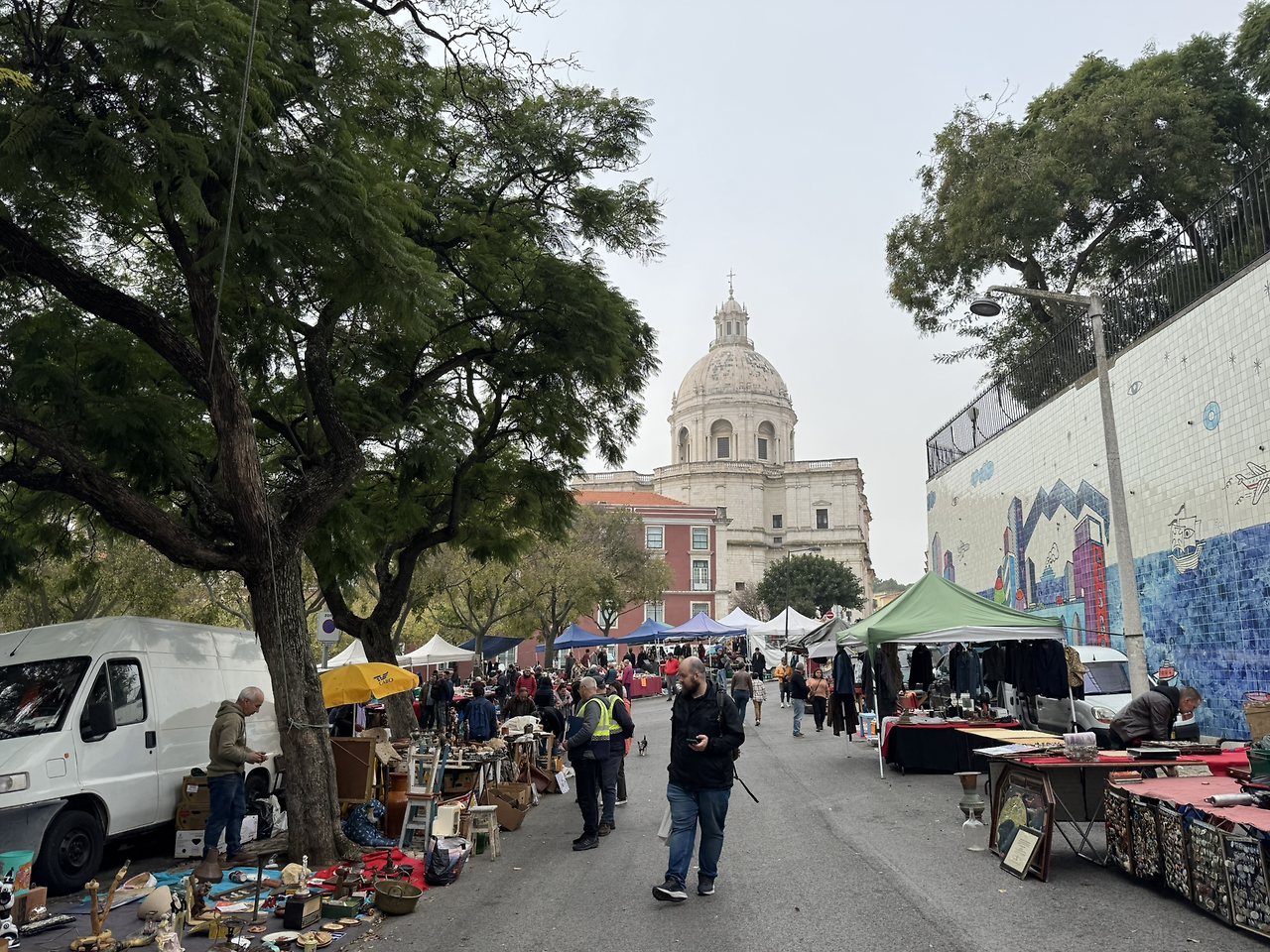 리스본 도둑시장은 화요일과 토요일에 열리는데 마침 이날은 토요일이었다. 나와 아내는 시차 적응에 절반정도 실패해서 일찍 일어났다. 덕분에 포르투행 기차 탑승까지는 6시간 정도의 여유가 있었다. 침대에 누워있으면 뭐 하나 싶어 도둑시장으로 향했다. 도둑시장은 국립판테온 바로 옆에서 열린다. 그래서 도둑시장이 열리는 날에 방문해서 판테온도 같이 보고 오는 코스를 추천한다. 다소 으스스하고 가파른 골목길을 오르다 보면 판테온이 보인다. 그리고 그 앞에서 이른 아침임에도 수많은 사람들이 땅바닥에 물건을 전시하고 있었다.