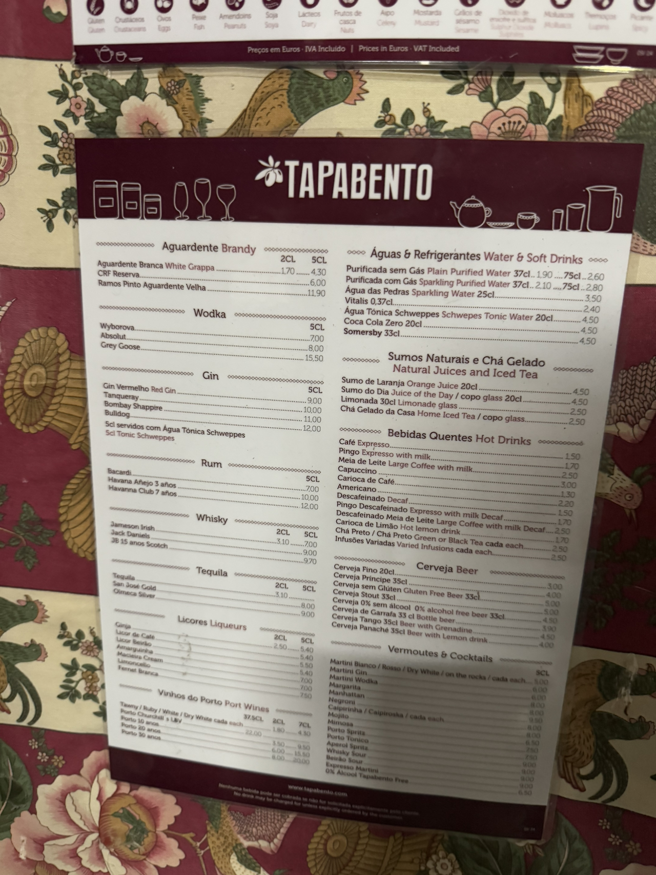7시에 저녁 오픈인데, 6시 40분쯤 가니 웨이팅 없이 들어갔다. 다만 예약하면 훨씬 편할 것 같다. 예약자들을 우선 들여보내줬다.(알아보니 예약은 전화예약만 된다고 한다.) 음식은 아시안과 포르투갈 음식 등 세계적 메뉴가 다 있다. 그래서인지 한국 메뉴판도 있었다. 또 미디어의 힘 덕분인지 한국인들이 굉장히 많았다. 포르투 전통 음식을 먹고 싶었던 아쉬운 마음을 포르투 와인으로 달래고자 가장 작은 사이즈인 2cl을 시켰다. ml가 아닌 cl이라 단위를 헷갈렸다. 게다가 가격도 8유로라 적어도 200ml 정도는 되는 줄 알았다. 2cl이 20ml인 것은 서빙된 잔을 보고 알았다. 약 0.3모금 정도 양이라고 생각하면 된다. 와인을 시킬 때는 용량을 꼭 확인하고 시키길 바란다.