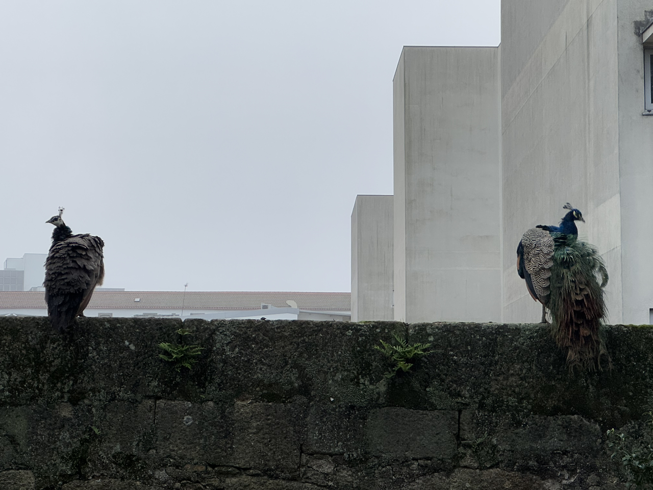 새벽 수정궁 공원의 안개, 수정공 공원의 명물인 공작새, 서로 다른 쪽을 바라보는 중.