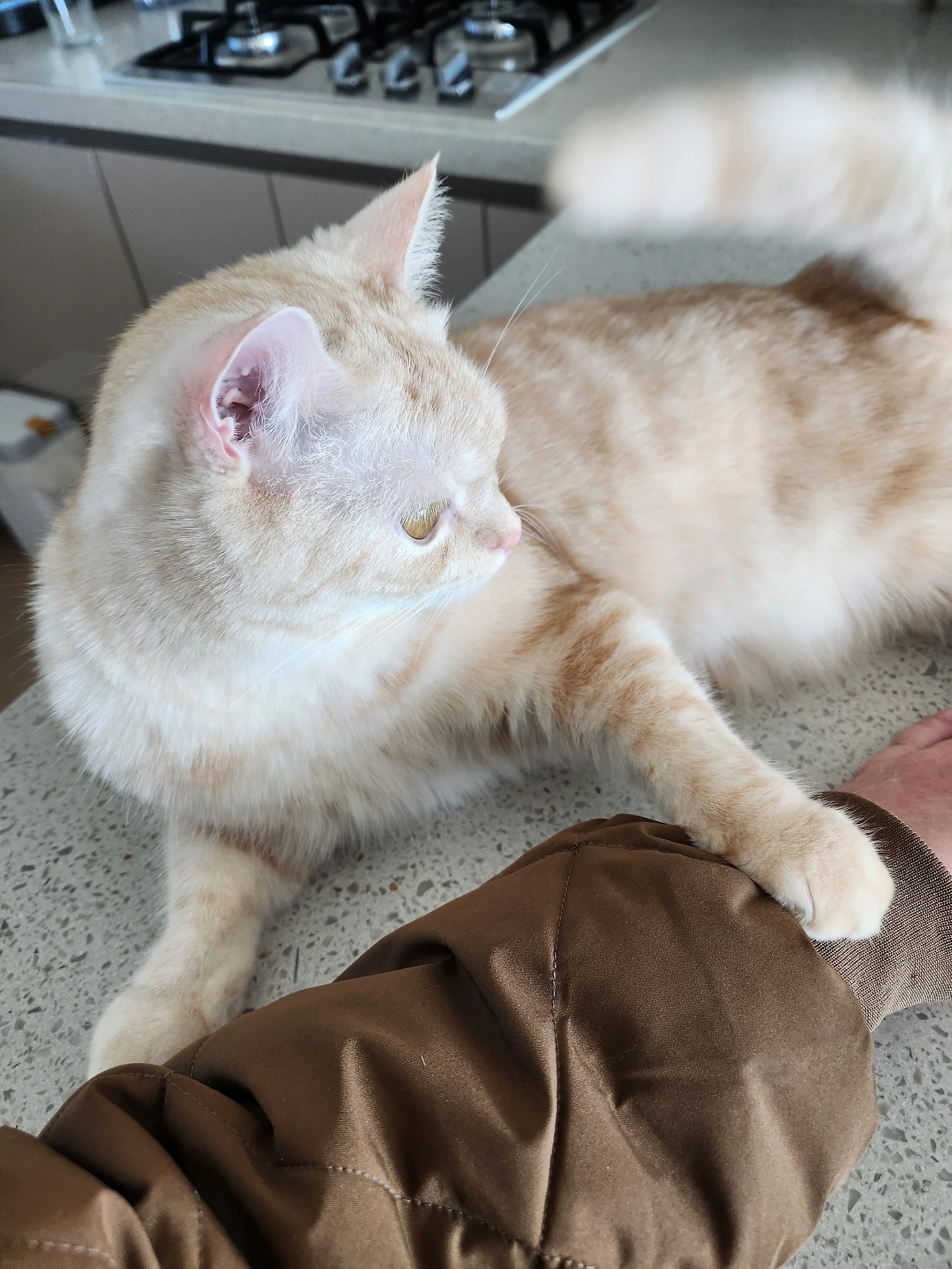 큰 고양이가 식탁 위에서 나를 부른다. 고양이에게 가서 고양이의 발에 나의 손을 올려 놓는다. 그러면 고양이는 발을 빼서 내 손 위에 발을 올린다. 그리고는 내가 보는 앞에서 잠을 잔다. 쓰담쓰담 등을 쓰다듬어 주면 갑자기 일어나 내 손을 문다.