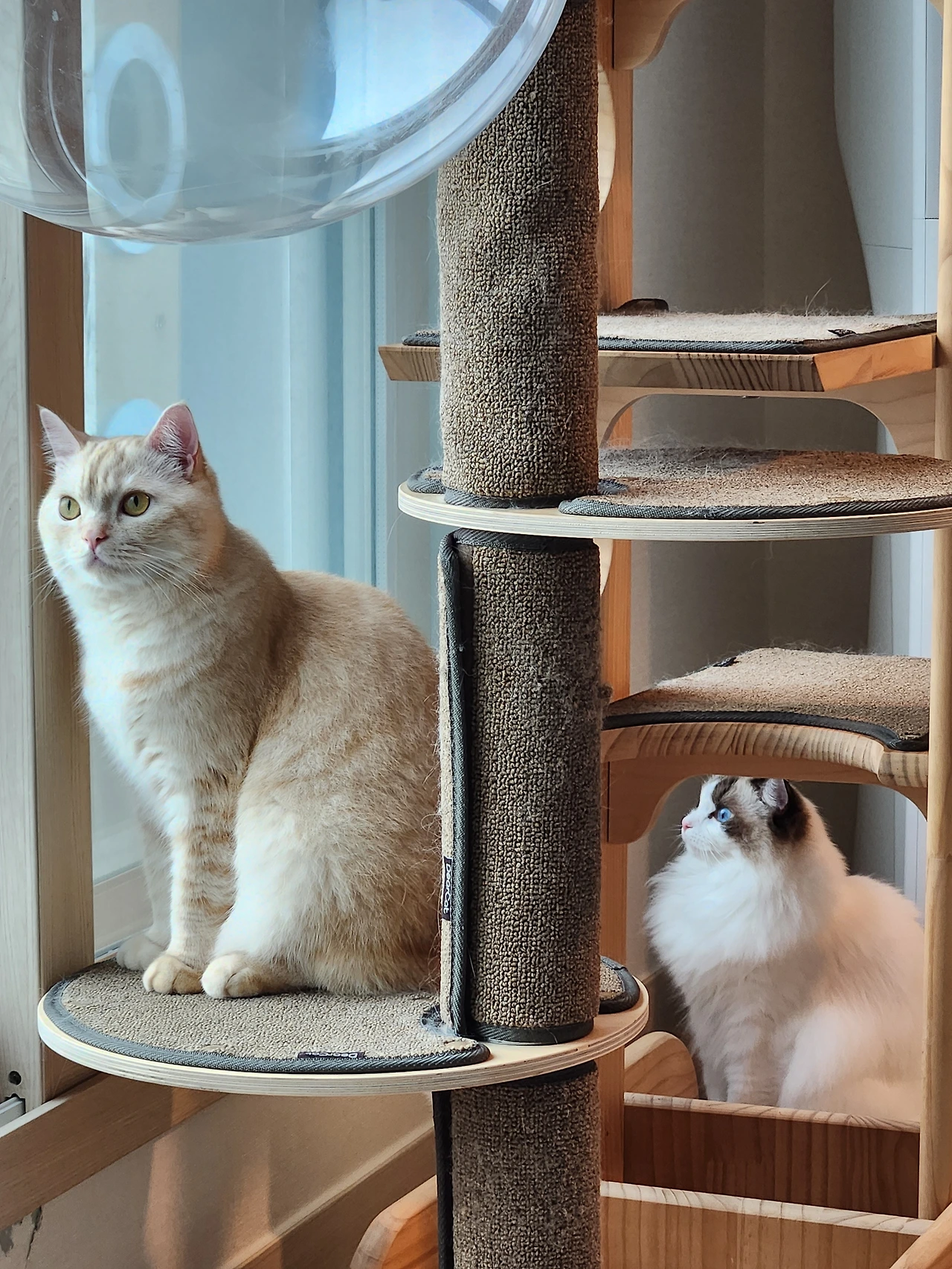 신이난 고양이는 캣휠에서 펄쩍 뛰어내려 캣타워에 뛰어 오른다.