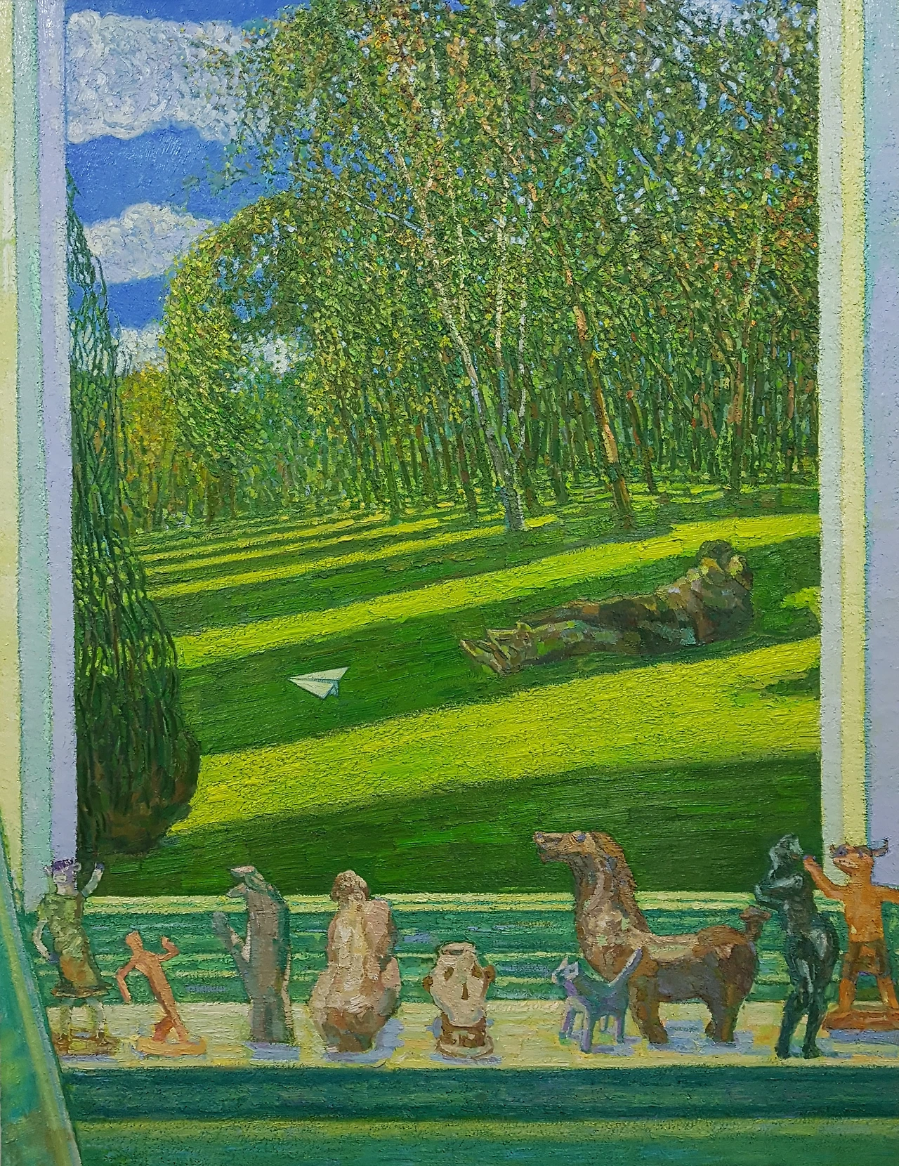 2020.9.8 호수공원에 나왔다. 바람이 좀 불었지만 날씨가 좋았다. 주섬주섬 챙겨 온 화구를 펴고 그림을 그리기 시작했다. 얼마 지나지 않아 젊은 남녀가 바로 코앞에 자리를 펴더니 음악을 틀어 놓고 곧장 드러누웠다. 그들은 타인의 시선 따위는 아랑곳하지 않았다. 꿈지럭거리는 꼬락서니가 영 눈에 거슬렸지만 몹시 부러웠다. 그들의 형상은 풍광의 한 조각이 되어 그림으로 스며들었다. 어디선가 날아든 종이비행기의 뾰족한 끄트머리가 녀석의 목덜미를 콕 찔렀으면 좋겠다는 생각이 언뜻 들었다. 순간, 목덜미가 근질거렸다. 으아 앗! 송충이가 툭, 투둑 떨어졌다. 이런.. 갓난아기의 손가락만한 송충이가 바짓자락이며 물감통 위를 기어 다니고 있었다. 2022.12.3 창문을 사이에 두고 그것들이 하나 둘 동원됐다. 점토로 빚은 반인반수 미노타우르스와 춤추는 아이, 목각 분절 손, 귄진규의 테라코타, 노은님의 도기, 목각 냥이, 마티스의 브론즈 등등. 사건이 기억 속에서 소환될 때마다 그림은 조금씩 자라났다. 륮