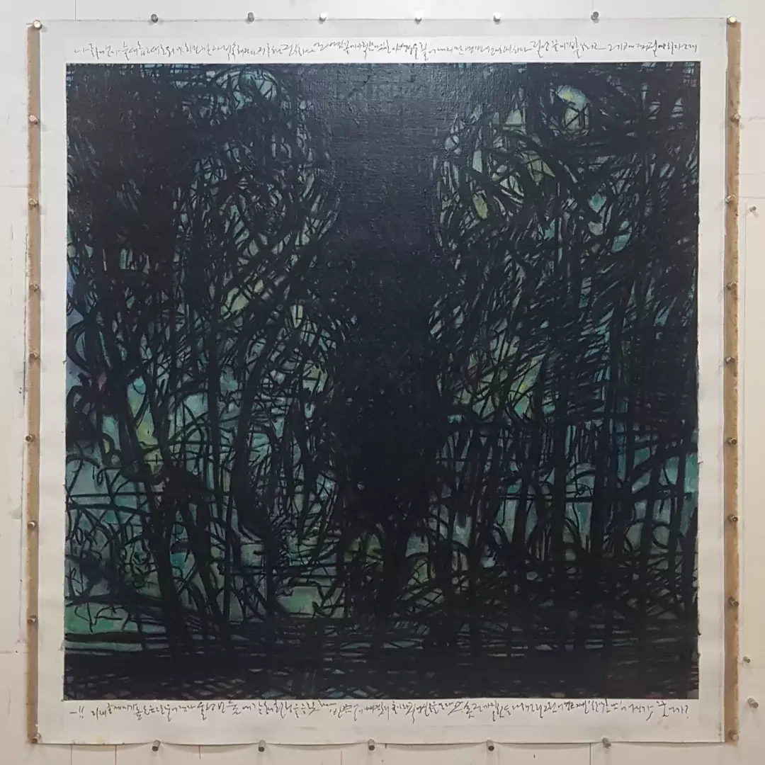 높은음으로 울어댄다. 울창한 숲에 갇혀 환청을 듣는 듯하다. 반쯤 얼이 빠진 채 돌아와 작업실 문을 연다. 앗! 좀 전까지 온 힘을 다해 그린 그림이 방금 지나온 '한여름 밤'이 아닌가, 꿈인가? 륮