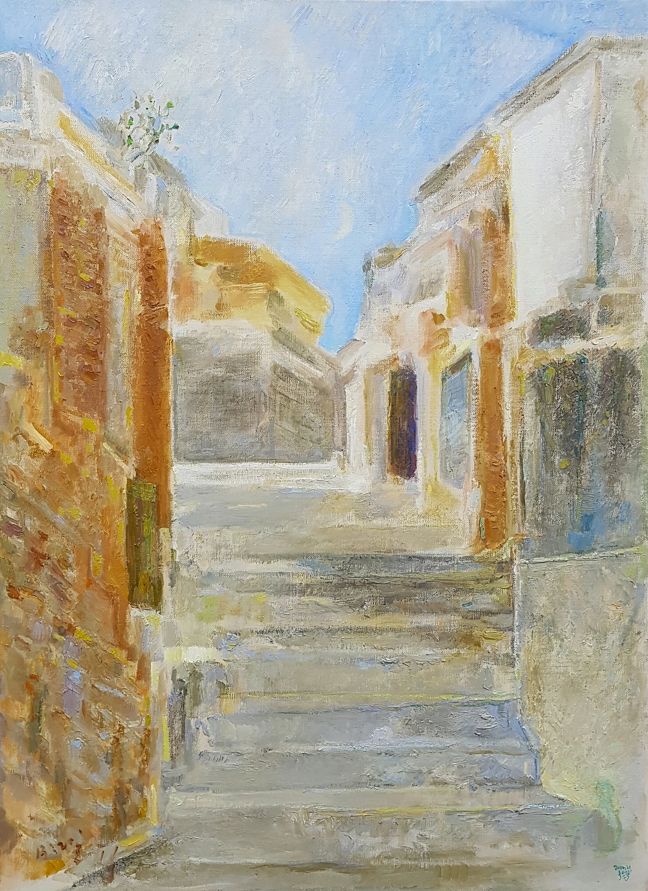 2009.3.21 토. 오전 11시다. 초여름 같은 봄 날씨다. 처음 한남동을 그렸던 그 골목길을 찾았다. 하늘이 맞닿아 있어 그런지 골목길은 빛으로 가득했다. 그늘도 밝게 느껴졌다. 종이를 펴고 그리기 시작했다. 얼마쯤 지났을까. 한 남자아이가 살그머니 다가왔다. 옆에서 한참 지켜보더니 아예 계단의 구석에 자리 잡고 앉았다. 흘끗 눈이 마주쳤다. ''널 그림에 넣어줄까?'' 아이는 고개를 꾸벅였다. 얼마 지나지 않아 누군가 아이를 부르며 찾았다. 그림 속에 잠시 나타났던 아이는 그림이 진행되면서 희미하게 사라졌다. <13:00>