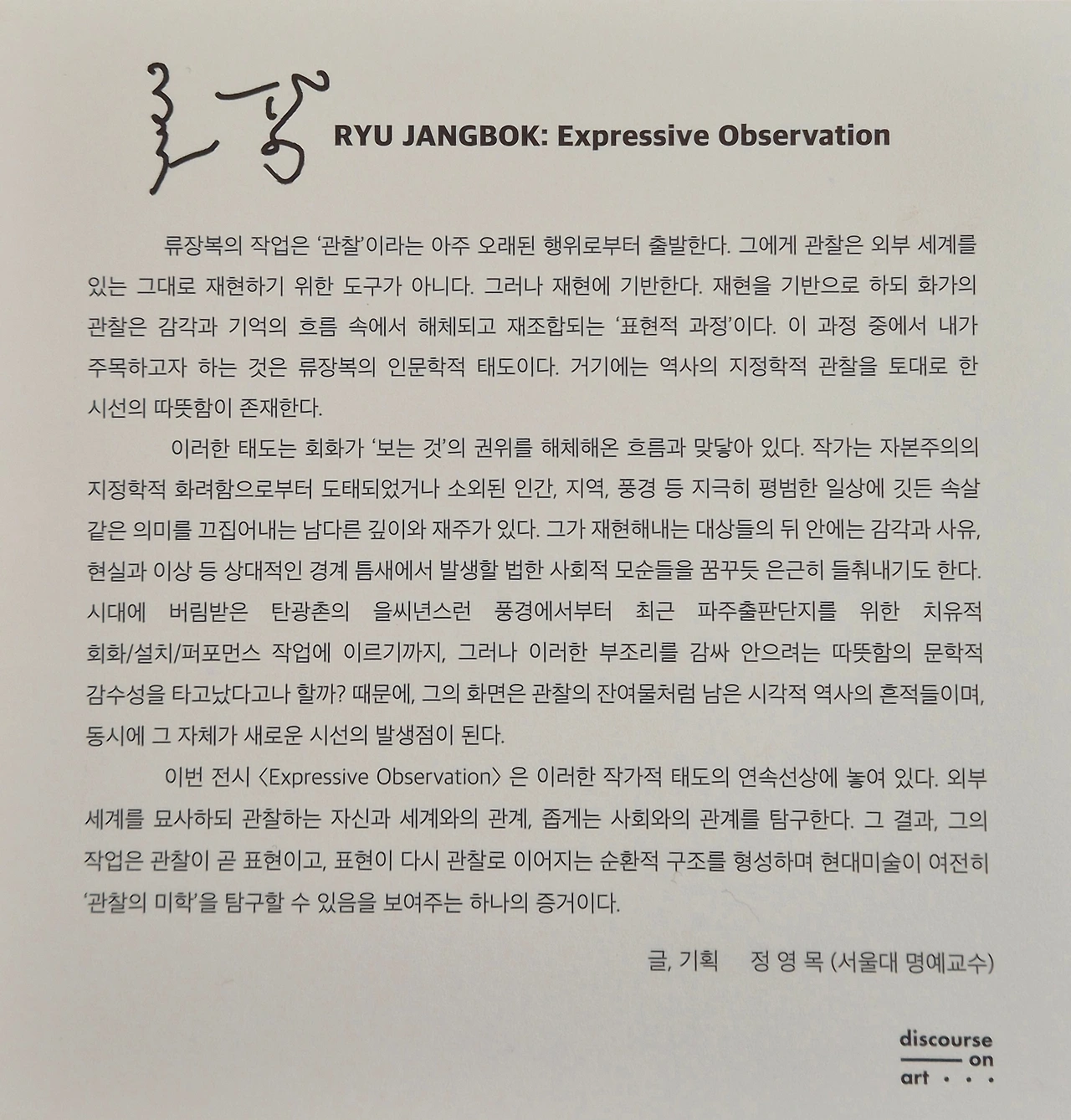 “본 전시 《EXPRESSIVE OBSERVATION: ON THE WORKS OF RYU JANGBOK》는 ‘관찰의 언어’를 새롭게 제안하며, 우리가 무엇을, 그리고 어떻게 보고 있는가를 질문한다. 류장복 작가의 작업은 그 질문에 대한 시각적 응답이자, 현대미술 속 ‘관찰의 미학’을 다시 일깨우는 증거이다.“ 글_정영목