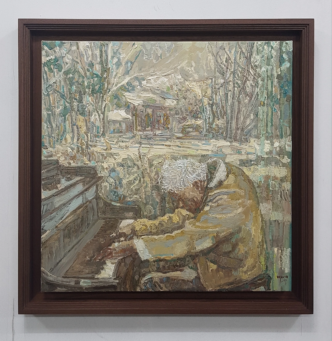 작년 이맘때다. 2020년 12월 3일 첫눈이 내렸다. 펑펑, 함박눈이 쏟아졌다. 작업실 앞 공원이 하얗게 뒤덮였다. 삽시간이었다. 재빠른 붓으로 장면을 캔버스에 옮겼다. 이듬해 일월 아직 젊은 화우의 부고를 접했다. 한동안 하얗게 텅 빈 머릿속을 울리는 말도 음도 아닌 소리에 시달렸다. 그즈음 우연히 인터넷에 떠도는 늙은 피아니스트의 연주를 들었다. 그는 90여 세의 노구를 일으켜 어린아이와 같은 부드러운 손길로 건반을 어루만졌다. 내 머릿속에서 웅웅대는 소리가 누에의 실처럼 뽑혀 나오는 듯했다. 그의 연주는 첫눈 내리는 그림 속으로 스며들어 무한 반복되었다. 2021.12.6 륮