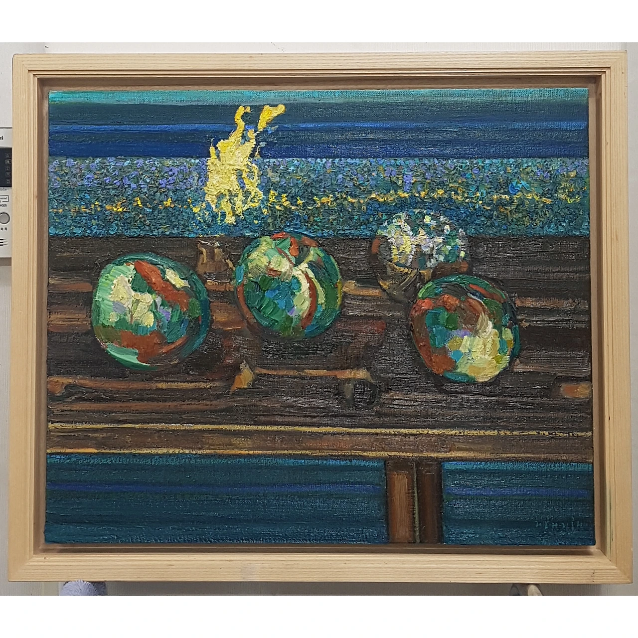 지난여름, 선반 위에 동그마한 자두 세 알. 안과 밖의 온도차가 거의 없는 밤이었다. 축 늘어진 몸의 풀린 눈까풀 아래로 그것들이 들어왔다. 싸구려 선풍기의 더운 바람이 닿을 때마다 자두 색깔이 색동스럽게 변했다. 벽에 기대 놓은 캔버스의 아랫자락 그늘에 푸르스름한 형광등 빛이 어른거렸다. 급기야 검푸른 물결이 되어 일렁거렸다. 몽돌 해변의 자갈밭이 달빛에 반짝거렸고 모닥불이 타올랐다. 밤바다가 깔때기의 좁은 구멍으로 노려보기 시작했다. 자두는 풍경 속으로 굴러갔다. 2018.10.11 륮