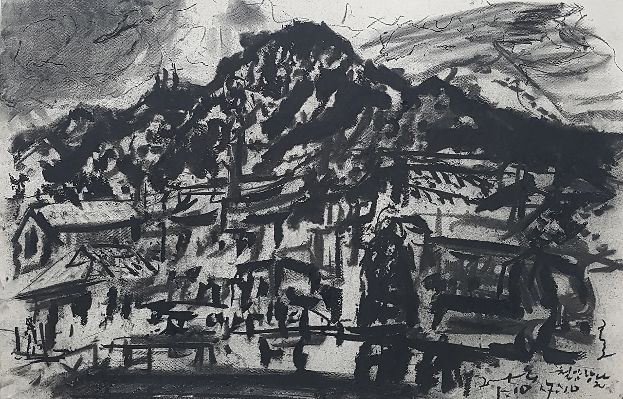 다. 흘끗 보며 고개를 갸우뚱거렸던 사람들의 표정을 그림 바깥에 두고 목탄을 후려쳐 허공을 나아갔다. 거의 한 호흡이었다. 어언 20년 전 일이다. 그때 거길 지금 여기로 끌어오고 싶다. 그립다. 2022.2.23 륮