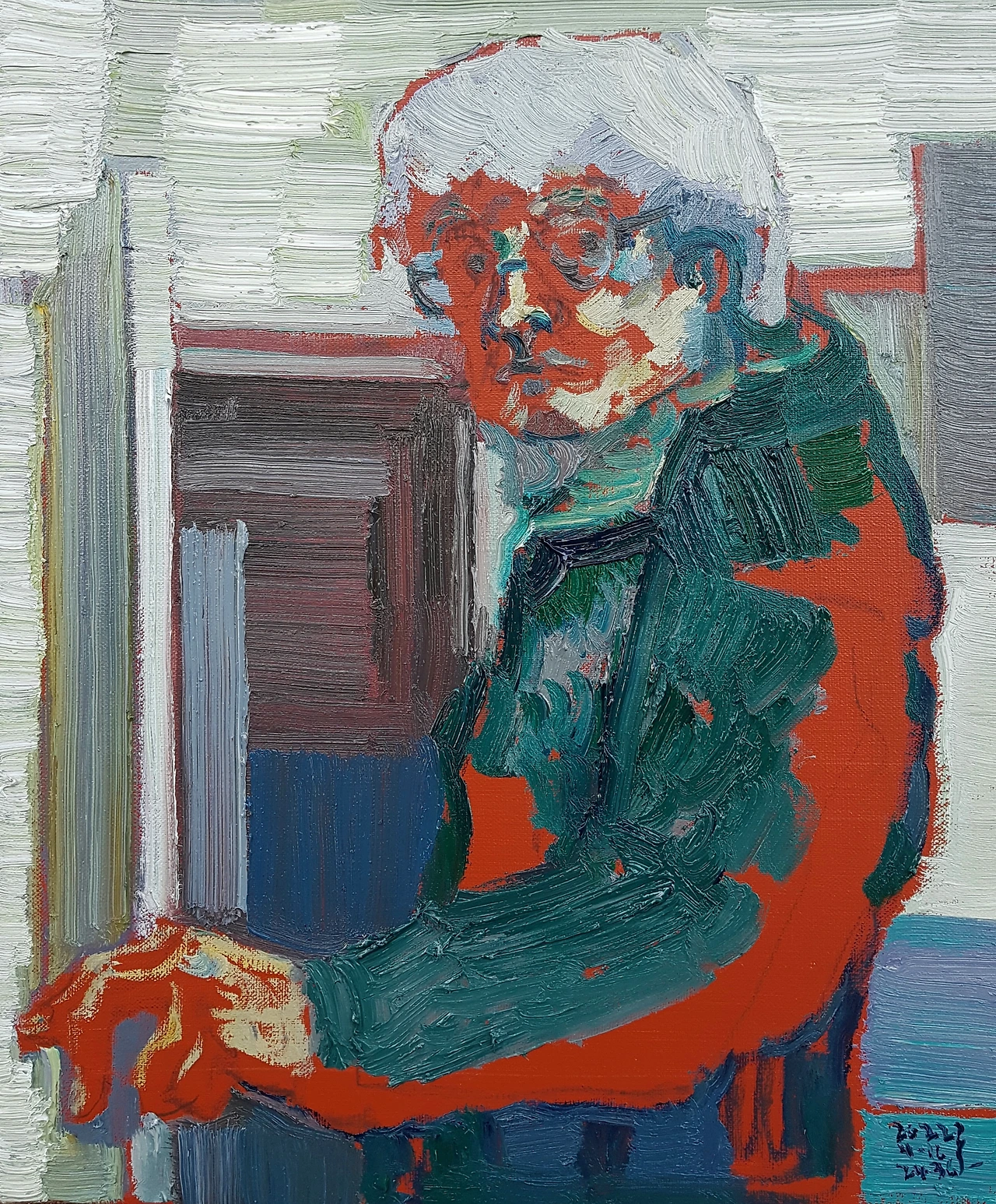 반쯤 열린 문 앞의 자화상_oil on linen_45.5x37.9cm_2022