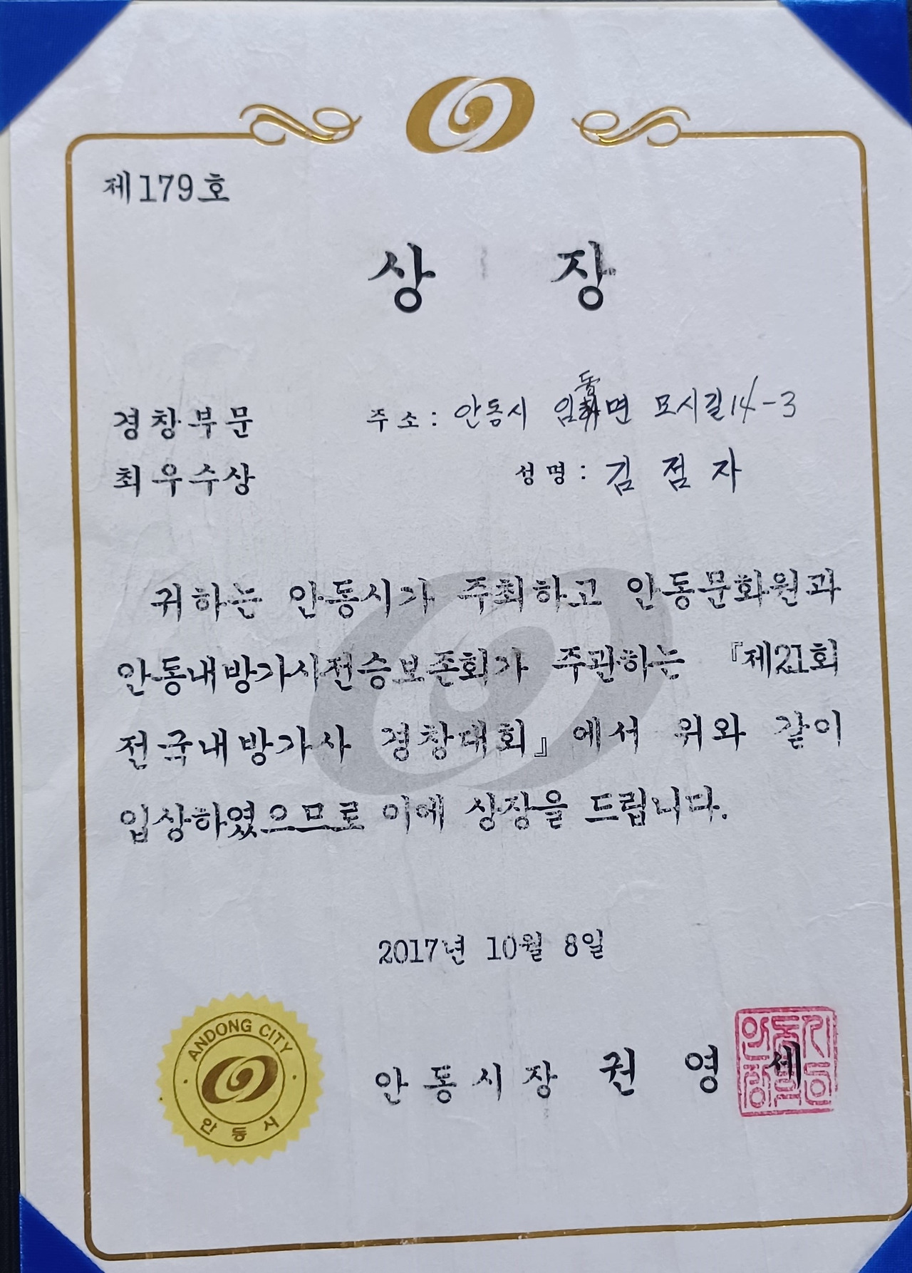 제24회 전국 내방가사 경창 대회에서 창작부문 최우수상을 받은 김점자 어르신이 지은 내방가사 제목은 ‘시어머님 사친가’다. 친정어머니도 아닌 시어머니를 그리워하며 지은 가사로 내용 또한 듣는 이에게 눈물을 짓게 만든다.