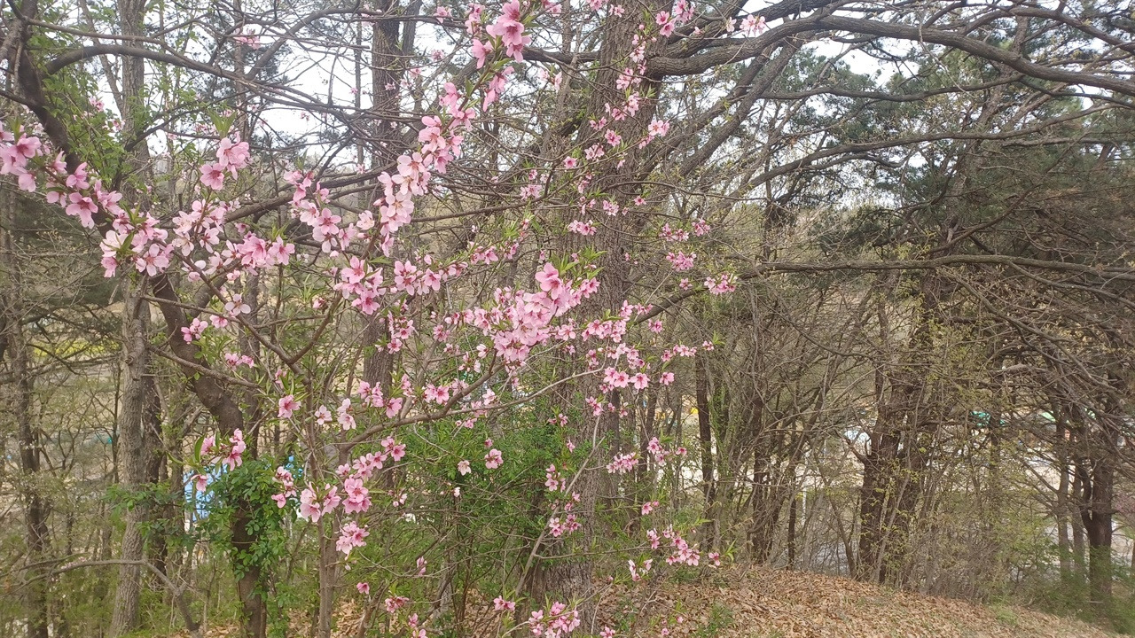 매화, 벚꽃이 사라지는 아쉬움을 복사꽃이 달랜다. 붉디붉은 꽃잎 속에 암술, 수술을 내밀고 꿀벌을 기다리고 있다. 아니 차디찬 겨울바람을 이기고 이제야 아름다운 자태를 보여주는 모양이다.