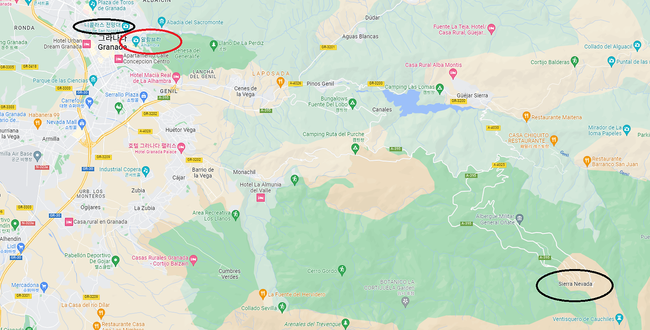 알바이신 언덕에 서면 시에라네바다산맥을 배경으로 서있는 알람브라를 볼 수 있다
